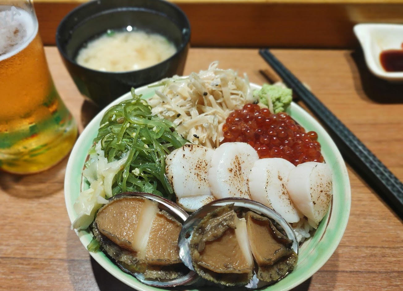 特別喜歡它們家丼飯有海帶絲、牛蒡絲配菜超級下飯 看圖就知道生魚片頗有水準,口感新鮮 價格中等,雖不至平價卻也不貴 湯的部分還可以續加 CP值點滿啊!!!