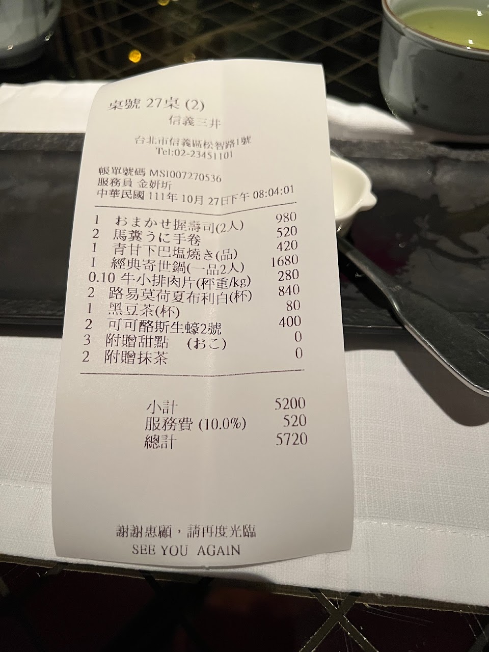 主餐吃了幾口發現魚沒熟,反應之後有重新做一份,也招待手卷,手卷送來的時候說有一個有放蝦另一個沒有,我們也是覺得很奇怪為什麼?一問之下是服務員猜測有一個人好像不太吃蝦(不知道是不是在討論菜單到時候讓他有這種錯覺),不過感覺可以先問一下,不然細心的舉動讓我們一開始覺得有點滿頭問號