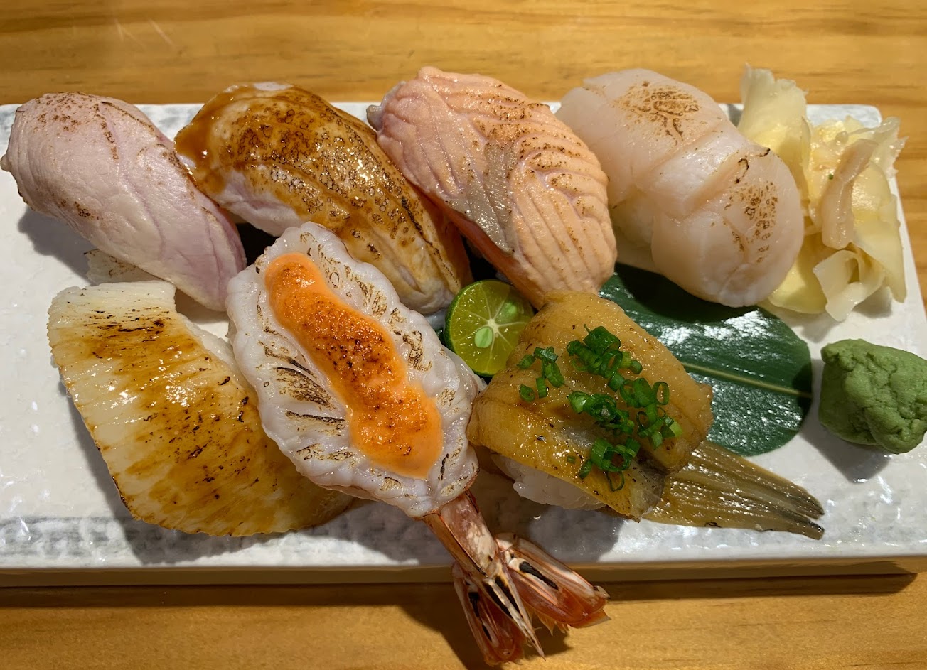 炎熱的天氣,剛剛好的冷氣,加上炙燒握壽司拼盤及冷盤小菜,對味!