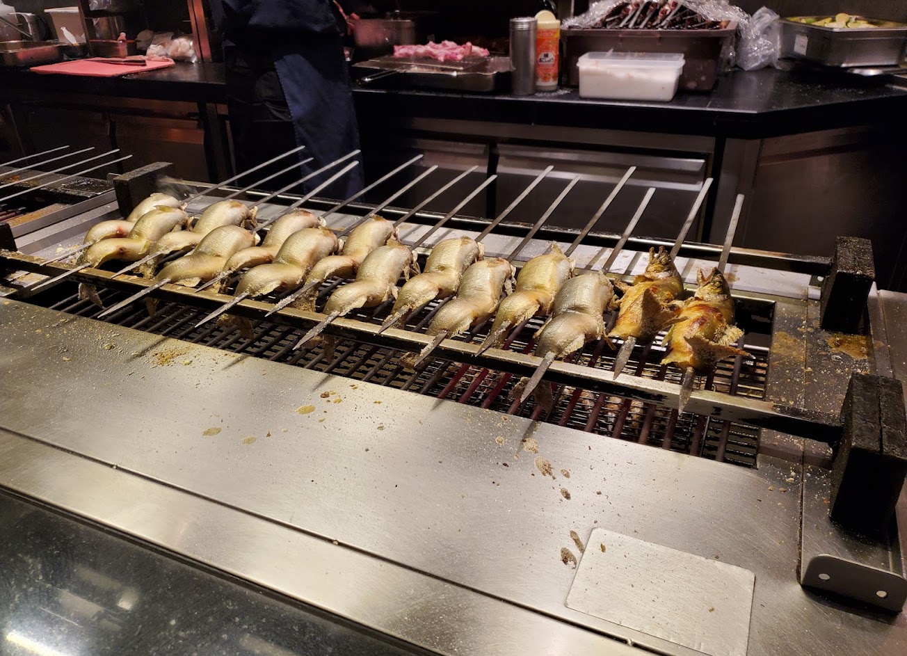 時間短想說一個人也不吃不了那麼久,結果動線一長條,我又座B區,要拿海鮮真的是有夠遠,然後走道不大人多怕撞到,到了料理區一堆人排隊,取餐的排隊方向也沒標示,吃到快離場我才知道香魚是要在烤香魚那邊排隊才能拿。