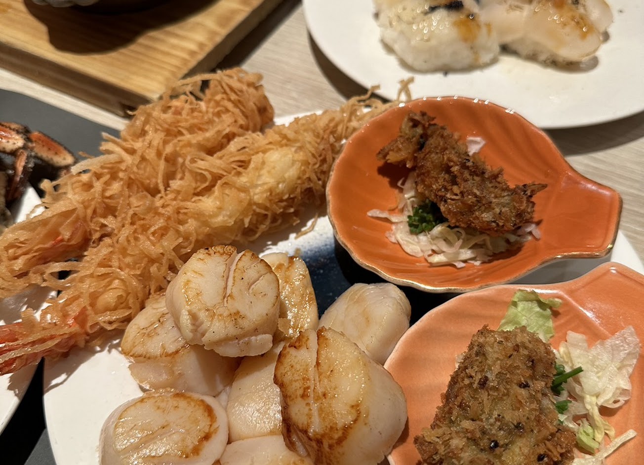一直訂不到的旭集,自從開始需要付訂位訂金後,就比較容易可以訂到位子了,這次是在平日晚餐的時候去用餐,期待已久終於吃到了,動線上確實比較不好,位子剛好又是在最後面,走到前區的飲料壽司區會走很久,不過就當作是吃飽起來走動走動是也不錯! 食物種類很多,海鮮的部分都很新鮮!螃蟹肉質很好,吃起來不是粉粉的那種,蝦子很彈牙!牛舌味道不錯,但就不會特別想拿第二次,主要是干貝真的好吃?拿了好幾輪! 壽司跟生魚片的表現也很好,搭配帝王蟹味增湯很讚! 烤物及炸物區食物雖然也不錯,但比較沒有記憶點,想吃的時候其實已經八分飽了! 比較可惜的是最後飽到沒吃烤香魚 甜點的人形燒也很好吃!內餡足夠,吃起來不會太乾,巧克力口味是偏苦的那種,不喜歡吃太甜的朋友也可以接受