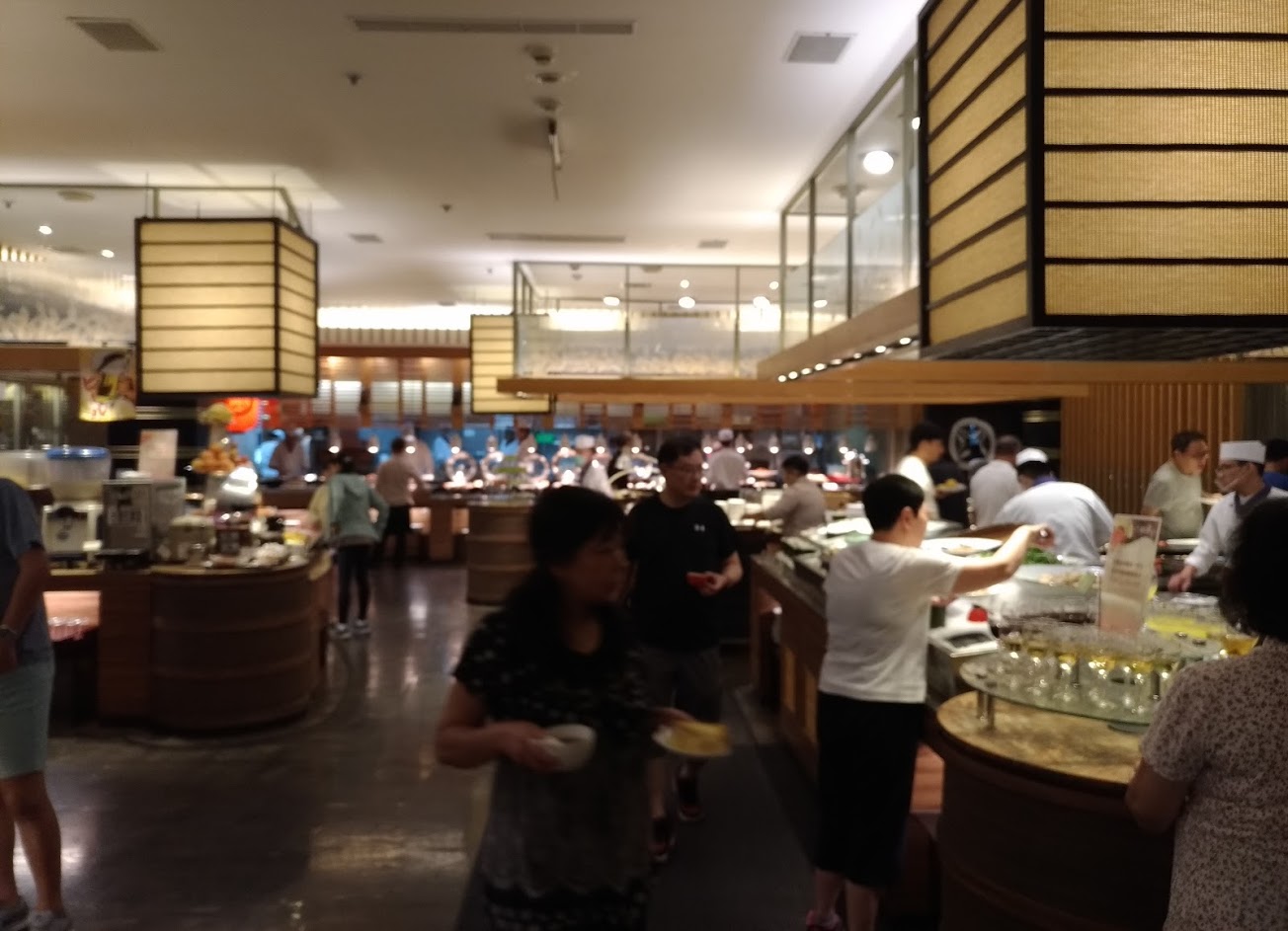 是比較偏日式的自助餐 餐點種類沒有到很多樣 但幾乎每一項都很好吃 連鮭魚炒飯都蠻驚艷的 生魚片真的是很新鮮 特別推薦鮭魚跟鮮蝦 但一次要多點幾份不然份量很少 飲料種類多有紅酒白酒還有好喝的梅子酒? 有四種冰淇淋要到甜點區點 煎肉排比較可惜只有牛肉而且有點柴 甜點種類多樣有一些小品還蠻驚艷的特別是千層派真的好吃 10到12人桌的座位太過擁擠 一次只能拿一大盤加飲料 空盤需要馬上收 且要端著盤子一直向別人借過 實在有點不便