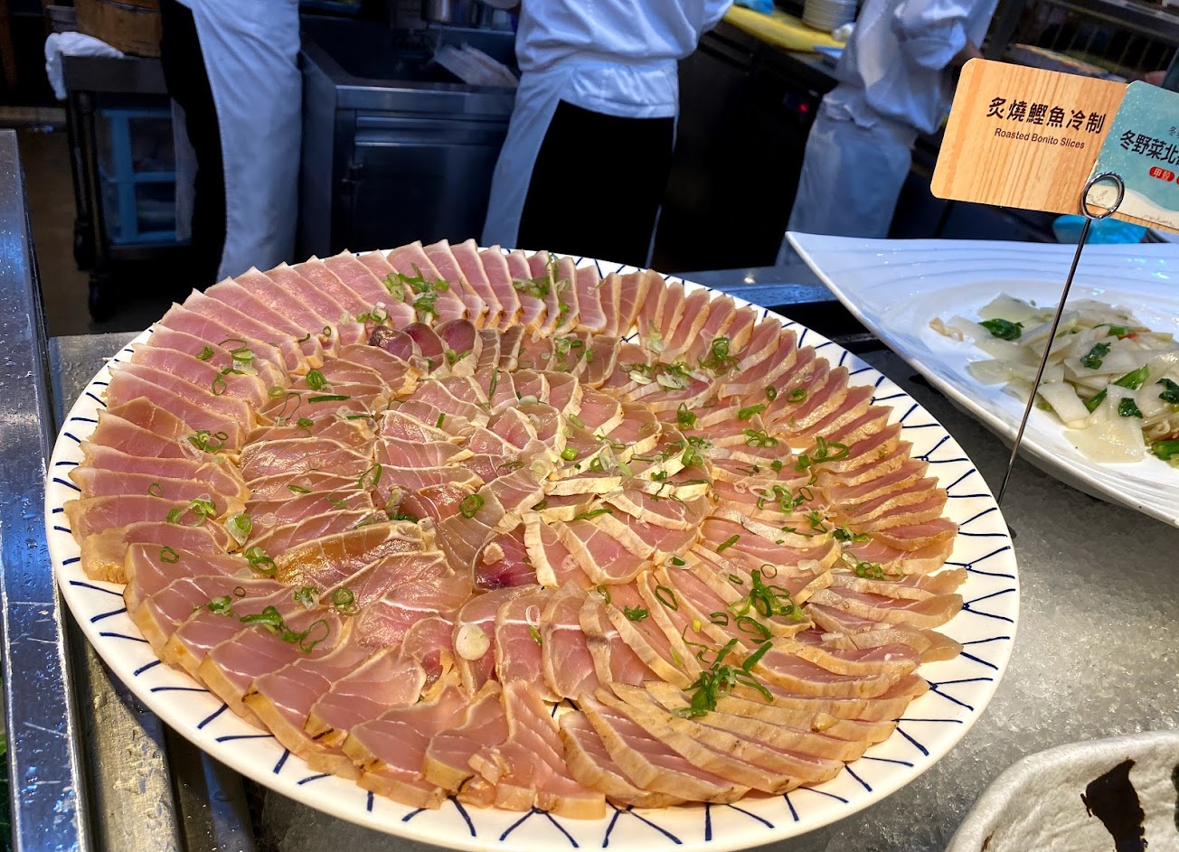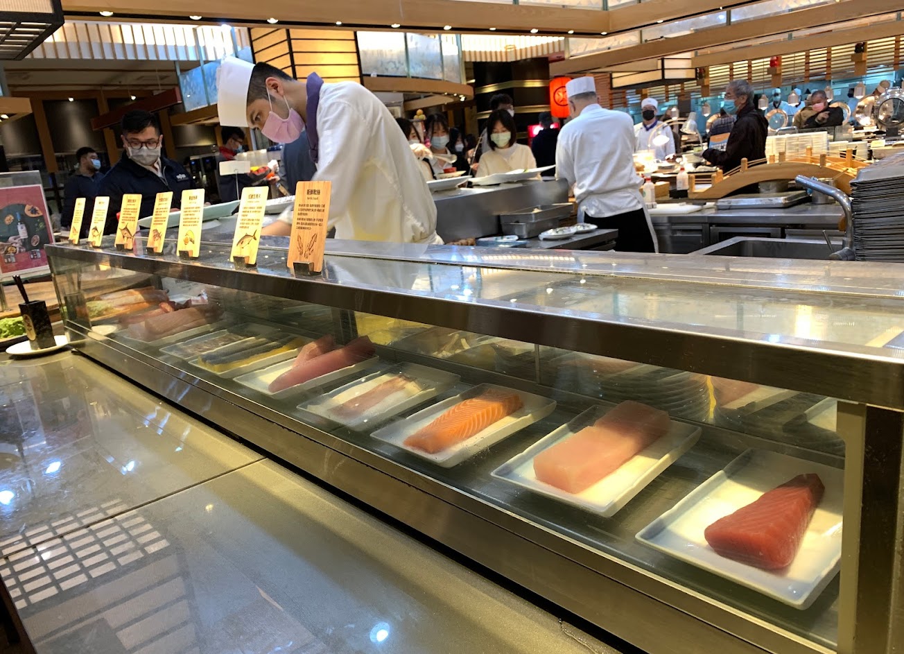 以品項來說東西沒有到特別多樣化 自助吧台區範圍不大 很快就能逛完 但是食材的新鮮度和品質是有的 個人最推烤物區的香魚 肥美肉多皮薄刺少 ? 再來就是生魚片 有好幾種魚類 現點現切 一份兩片不限分數? 爐烤牛肉也是沒有限制 看師傅切肉的手一直沒停下來過 辛苦了?♀️