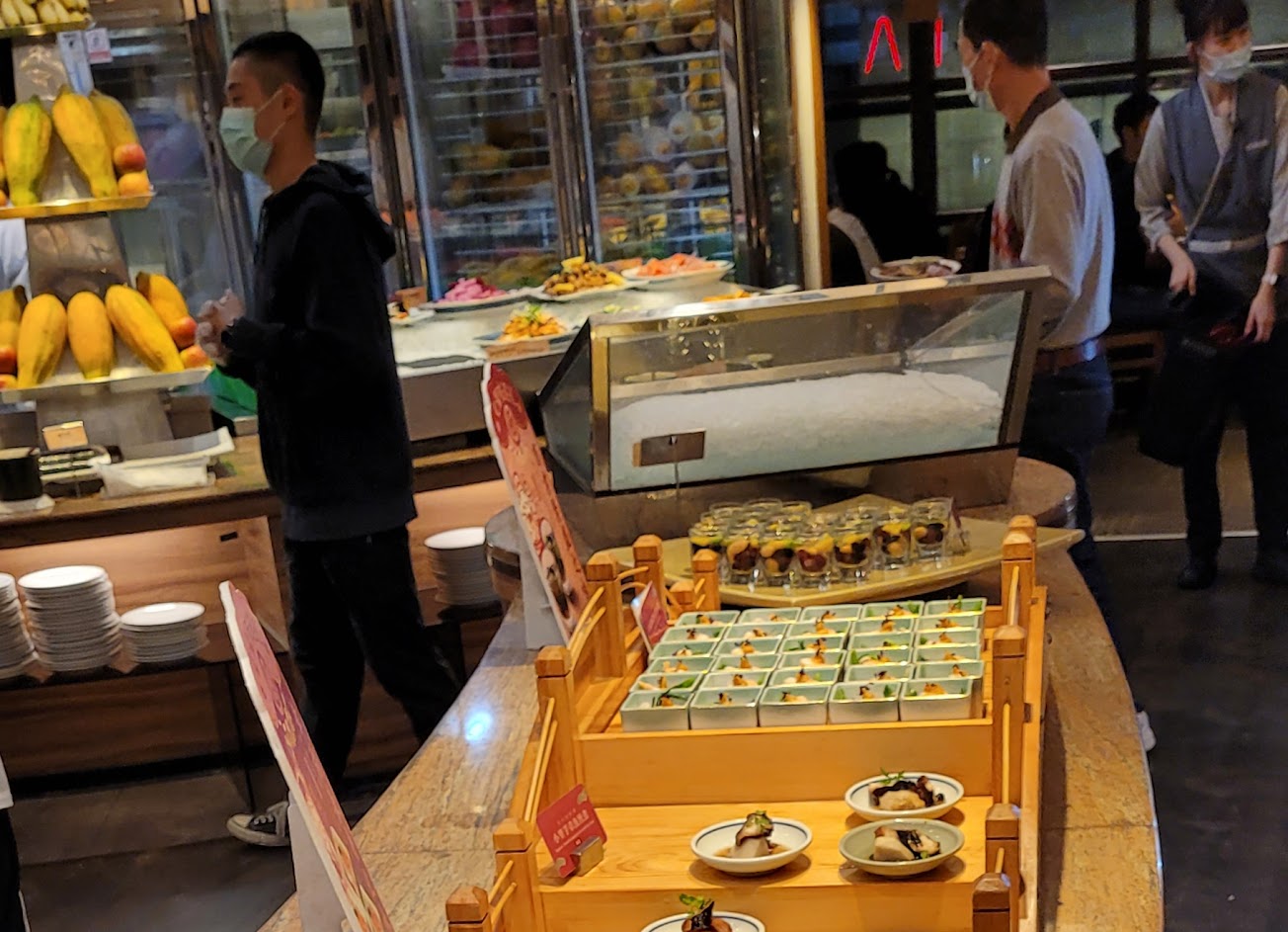 1.鮭魚卵手捲-料從高麗菜絲改為飯,大概裝到手捲高度3~4成的量,而給的鮭魚卵少到完全無法蓋住料的表面。 2.熟食區選擇明顯變少,還包含兩大盤幾乎沒人動的炒飯炒麵。 3.漲價前熱湯裡的料為塊狀的魚、雞肉,漲價後變成魚雞邊腳料;湯還是能喝,吃肉就別想了。 4.紅白酒本來是倒好一杯杯放在檯面上,想喝直接拿;現在藏到甜點區,需要請服務人員才能取用,且到用餐後半段時間,多數人都在排甜點冰淇淋,想喝酒也得跟著排,大家罰站罰起來。