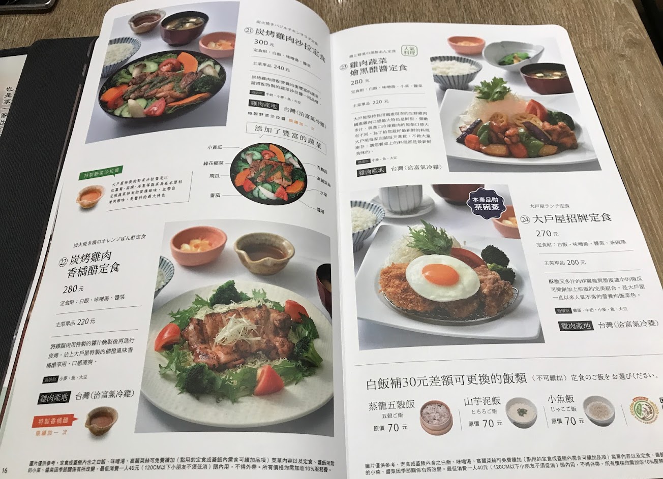 大戶屋主要是以定食為主,主餐種類多,豬排、雞肉、魚類料理通通都有,定食的飯、味噌湯和高麗菜絲可無限續。點餐是用桌上平板自行點餐,滿便利的,點完餐後服務生馬上就會送上點餐單確認,服務不錯。