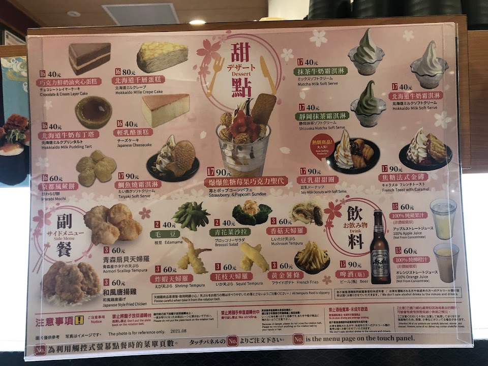 與日系在台迴轉壽司 「壽司郎」模式接近,兩層軌道,下層加蓋壽司迴轉道,上層點餐即時輸送道。官網入會自行預約時間準時到店,用餐限時1小時,算剛好無法恣意停留。壽司均一價40元,高級品兩盤計80元,附餐甜點另計,免收服務費。點餐系統快速無誤,但面板掛得太高無可移動,品項文字內容視線不及看不清,發生點錯,點錯無法修改或刪除。桌椅用餐環境寬敞舒適,但服務員不主動勸導小孩跑跳美中不足。店內多了盤子回收系統,獎勵一次投5個盤子,產生一次抽扭蛋機會。每桌面板上方附一台扭蛋機,自己投入10個盤子抽中一枚扭蛋,是「卡娜赫拉的小動物紙膠帶」。無茶包,以抹茶粉替代,味道極淡。推薦 「熟成鮪魚握壽司」「炙烤照燒花枝握壽司」「洋蔥鮭魚握壽司」。「炸蝦天婦羅手卷」海苔皮嫌韌,「香煎芝麻扇貝」略腥,「星鰻握壽司」魚軟嫩,可惜魚肉未吃即滑落。