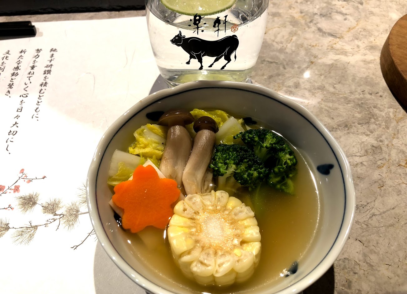 壽喜燒還有很大的進步空間,A4肩肉有不少不易咬斷的筋,在這等級的餐點不該發生。A5肋眼相較好多了,但也不到驚艷等級。但最大的問題還是在醬汁,標榜關西式壽喜燒,但我覺得和三盆糖只是好看,醬汁味道太強,只有死鹹,沒什麼效果,壓住了肉的甜味,也沒有軟化肉質。來這裡還是建議吃燒肉吧。