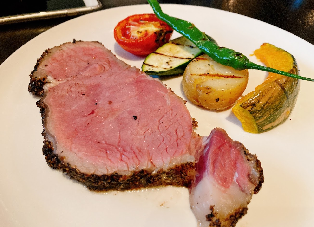 舒肥牛小排的部分有一點太油了,一定要配上沾醬不然會很膩口。菲力的部分,很軟嫩好吃,不論是單吃、加上海鹽、沾旁邊的醬料都很不錯(其中一個有花椒的醬我特別喜歡,很香又很特別)
