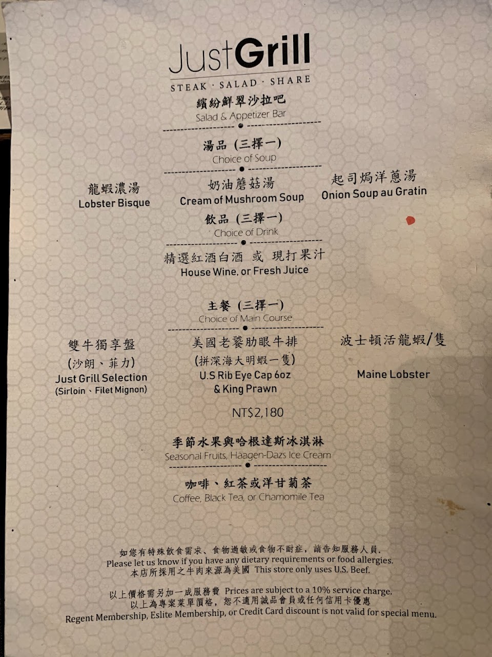 大概5月份的晚餐時刻去用餐, 點的是頂級老饕雙人品味盤,所以菲力、沙朗,老饕肋眼牛排都能吃到?真的非常的好吃?? 沙拉吧也很用心,最好吃的是涼拌蛤蜊,有泰式的感覺很辣很好吃。燻鮭魚我也給不錯的評價。 服務態度很好,因為我們點的松露薯條吃起來松露味道很淡,想說是不是調味不夠,請他們幫我們看看能不能多加一些,沒想到竟然重新幫我們弄一份….結果重新送上來松露味道還是沒有很重(可能原本味道就是這樣吧)但是真的服務態度非常好。 再來他們的噱頭應該是用很大的胡椒粒罐替客人撒胡椒粉,忘記拍到了,蠻有趣的。 壽星還有送上蛋糕,謝謝Just Grill 非常推薦? 餐點:5 服務:5 氣氛:5