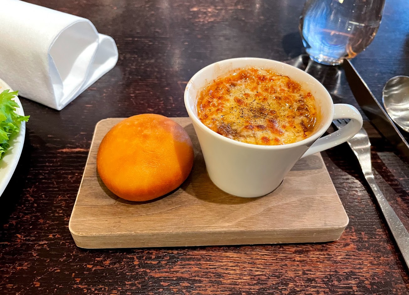 湯品介紹(主餐搭配湯品一份) ?龍蝦濃湯 只能說非常龍蝦?有點口味太重了 ?起司焗洋蔥湯 都搭配一顆炸銀絲卷,它非常好吃
