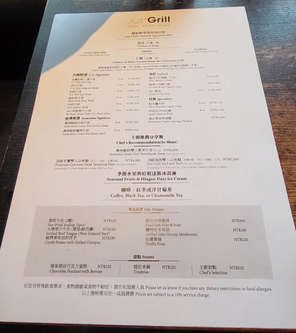 ✨Just Grill 這大概是我吃過最健康的自助 超多種沙拉系列的蔬菜 連我愛吃的過貓都有 菜都很新鮮~ 蝦子超脆超好吃 龍蝦濃湯跟炸麵包有點不太懂 主餐旁的蔬菜都很好吃 整盤菜色偏向像是爐烤的那種感覺 但是我的五分熟沙朗很熟,無血色有點難咬 朋友的就很嫩有點可惜~ 副餐紅茶⋯不行✋一口再見 服務生有點小冷漠?而且胡椒說暫停沒理我