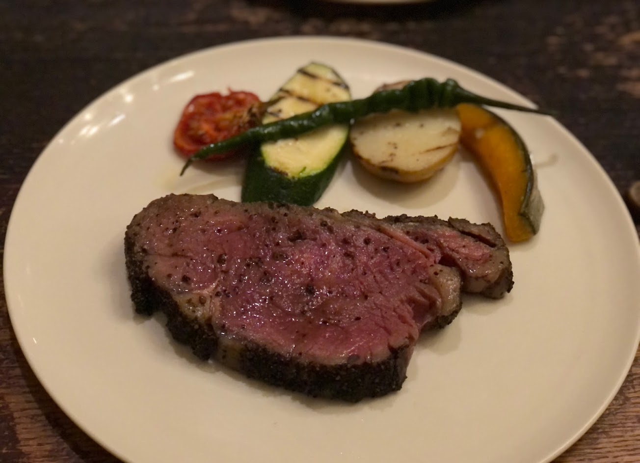 餐點點了龍蝦濃湯,裡面有小的龍蝦肉,味道挺特別的。主餐8oz的牛排有一點偏熟比較可惜,但肉蠻好吃的,餐盤裡的菜都蠻好吃的,尤其是節瓜,大條且多汁,十分有誠意。