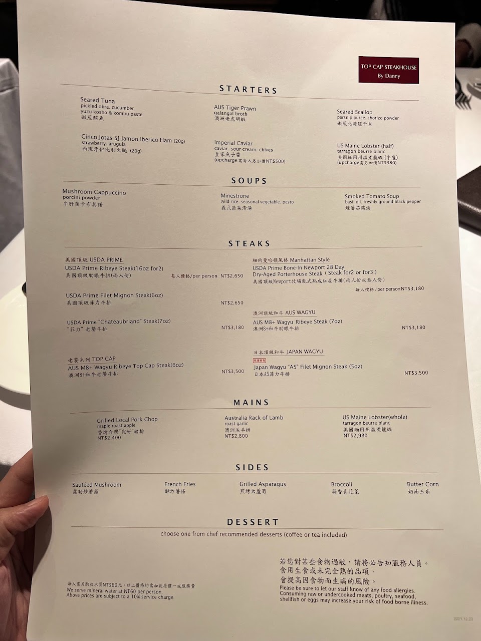 上週和老婆到Top cap吃中午套餐。服務還算不錯。但是一上來也不問就倒氣泡水是強迫中獎。餐點: 前菜只能算ok沒什麼驚艷之處。第二道湯是大失所望不只沒有特色可以說難喝。(我花六千元喝這種湯)第三道牛排只能說ok完全沒有牛排教父的風範!甜點一般般。最後我點了espresso 難喝。以前也吃過牛排教父的其他餐廳都沒有這次體驗‘那麽差’。