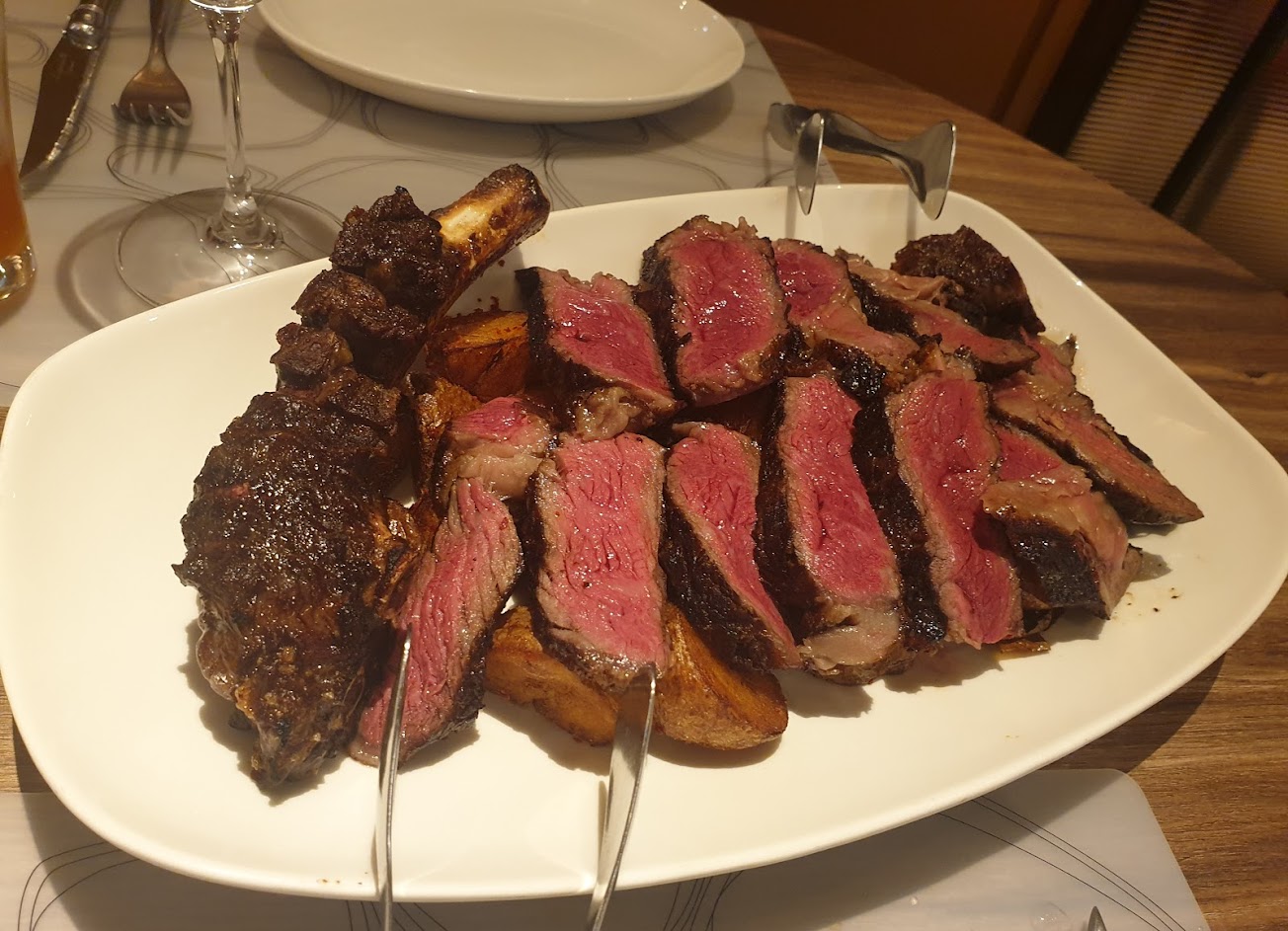 環境乾淨明亮,服務人員非常貼心而且親切。 烤火腿非常特別的味道,好吃不鹹。 鮭魚沙拉,切的剛剛好入口,清爽。 炸花枝,味道濃郁偏重,外皮酥脆,內裡多汁。 澳洲m5 帶骨20oz牛排,3分熟吃起來超好吃不會太老,表皮又酥脆,很推薦。
