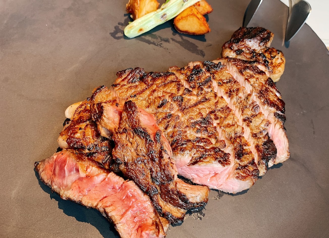 首先肉質還好,接近2000元的肉,我是覺得沒有這個價位。煎的太老,超過3分很多….說7分熟也不誇張。但已經切了幾口,就不退了。