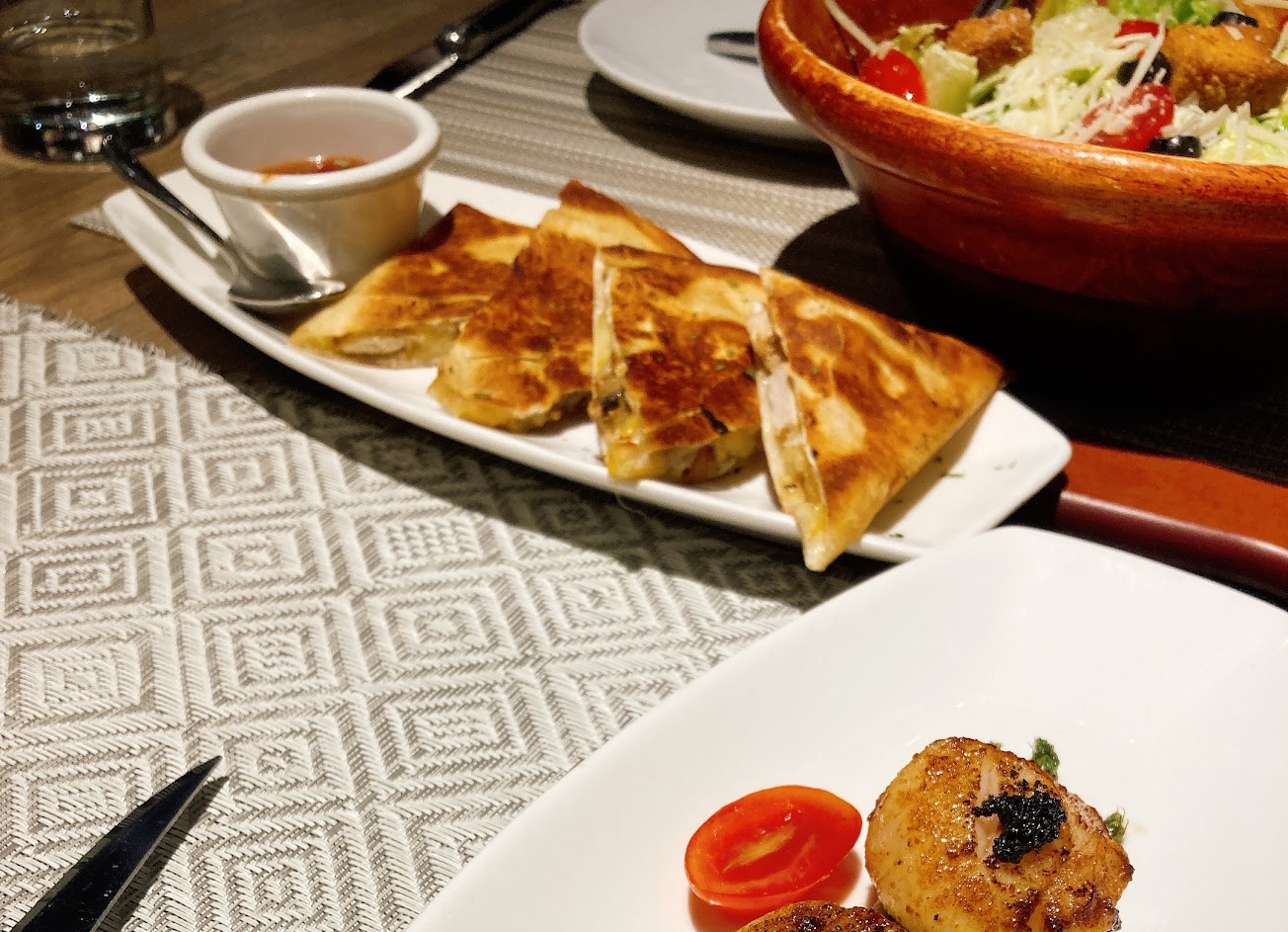 冰淇淋香熱巧克力布朗尼 干貝松露牛肝蕈菇燉飯 片燒嫩煎牛排佐香煎干貝 凱撒沙拉 菲力牛排佐香煎干貝