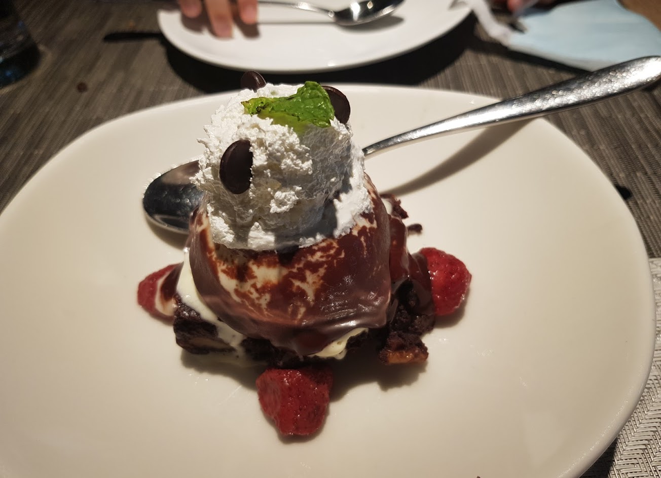 肉質嫩,干貝鮮 壽星享半價優惠 CP質高。 布朗尼,甜甜熱熱的巧克力加入冰冰的香草冰淇淋,淋上酸酸的草莓?,口感豐富有層次。