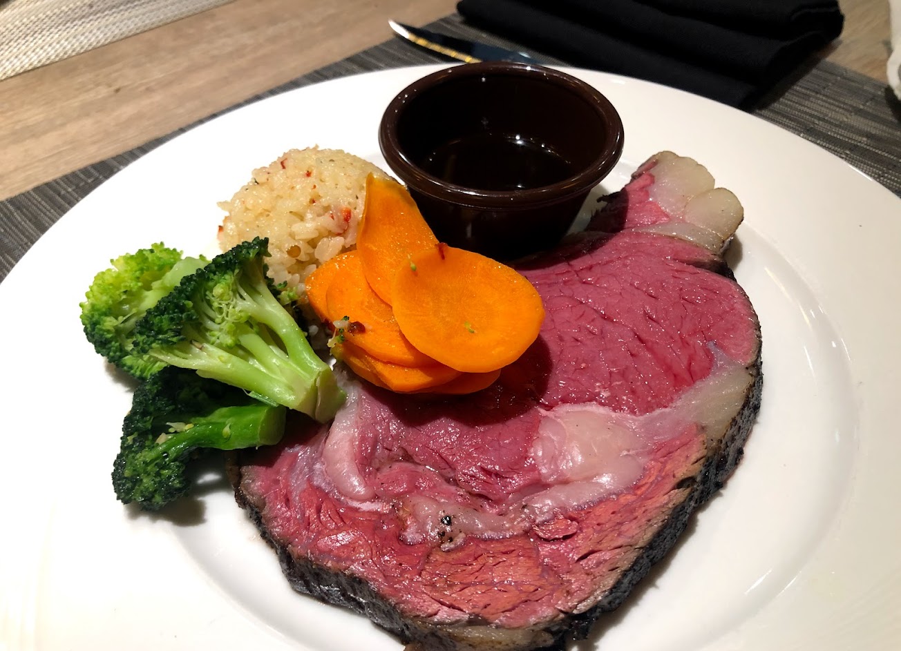 餐廳風格具有美式感,環境非常乾淨,服務人員有禮貌。點了兩款牛排,附菜選擇了四種:高麗菜沙拉、薯條、烤飯、馬鈴薯泥,附菜表現優秀,覺得烤飯很特別滿好吃的!高麗菜沙拉是拌好調味料的一球,口味覺得不錯但不驚豔,薯條中規中矩。菜單上除了一款雙人套餐之外,其他皆為單點,主餐點慢烤頂級肋眼牛排11盎司(鐵板香煎方式)!($1090)會額外附上三種調味:辣根醬、海鹽、黃芥末籽醬,牛排是Prime等級的口感相當好,雖然是肋眼油花稍多但很可惜牛排邊緣油脂沒有修邊,所以有一塊地方整個都是脂肪無法食用的!排除這點肋眼本身有醃漬過就帶有鹹味及香味不需加醬或是海鹽可單吃,但有附上一小杯類牛肉紅酒的醬汁,沾著吃有提升風味效果還蠻好吃!加點龍蝦尾($690)附檸檬和奶油醬不錯但是沒有想像中的嫩感彈牙,沒有腥味整體普通。另外點了紐約克,點了五分熟覺得口感普通建議要吃的人可以點三分,外表是脆脆的口感肉是原味整體普普!