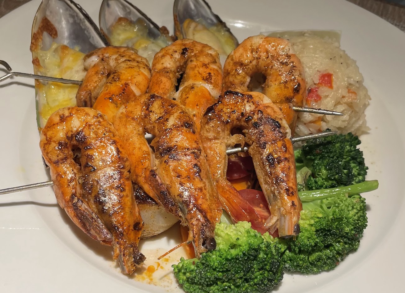 1/16/2022 在此地和好友聚餐, 總共 6 人, 點了 6 份主餐和兩份開胃菜 :大蒜蝦、新鮮干貝 (一份只有三顆, 點兩份) 這家餐廳是以牛排出名, 所以朋友大都點牛排, 只有一位點烤飯、一位點煎魚排. 魚排旁邊附的奶油蘑菇醬很鹹, 但搭配沒什麼味道的魚剛好. 份量也不錯, 是絕對可以吃飽的. 光吃牛排嫌不夠的, 還可以再單點一份串蝦放在上面, 也會吃得很爽.