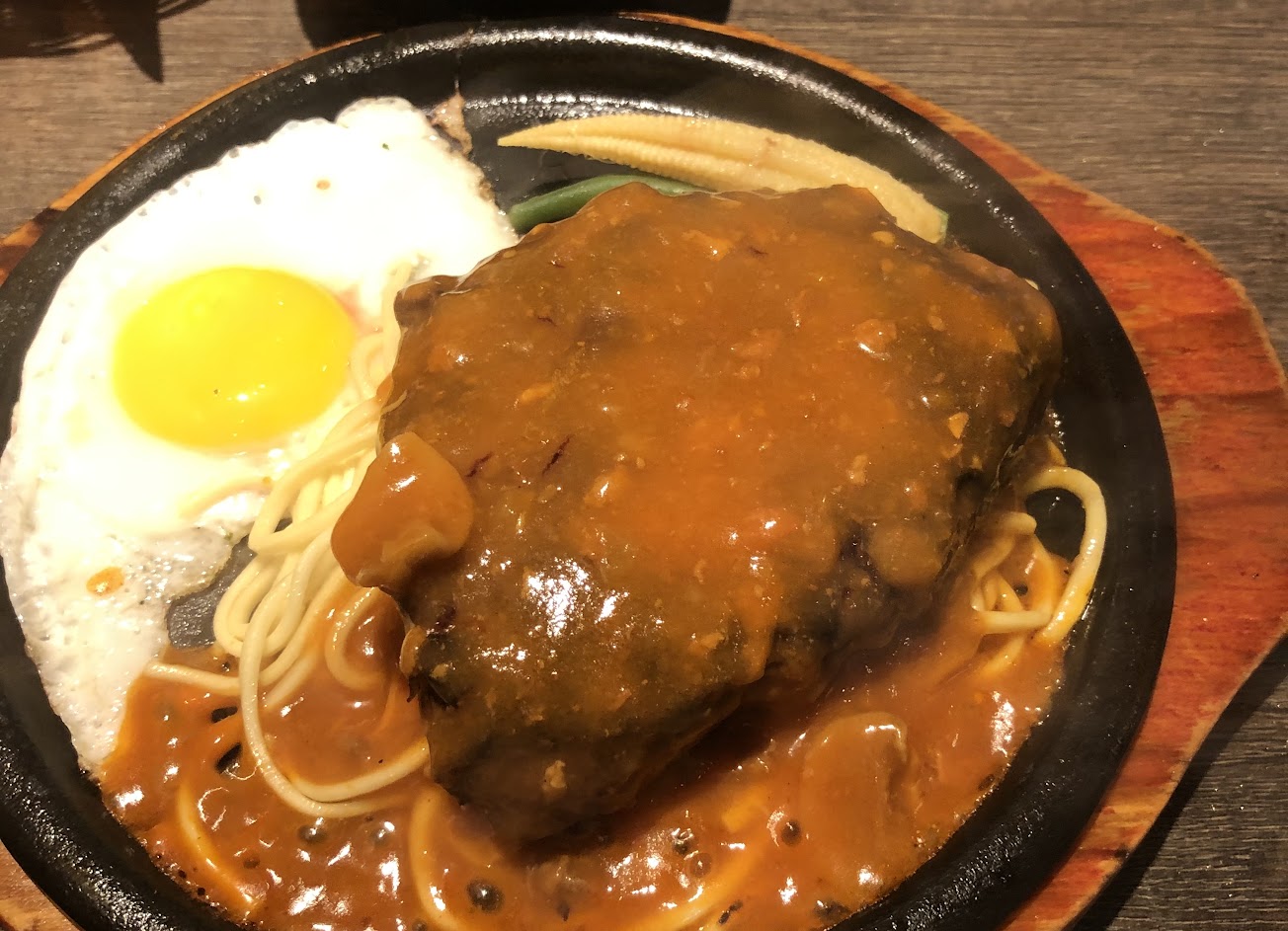 切片切的很好,肉質軟嫩卻不至於完全沒肉感。醬汁濃郁,搭配鐵板麵及半熟蛋。