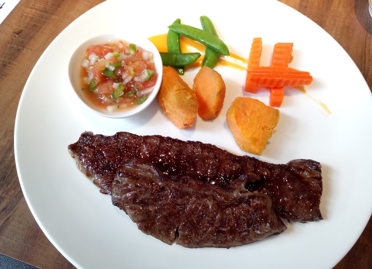 牛肉香氣十足且鮮甜多汁,油花分布均勻,偏兩側的牛肉吃得出碳火烘烤的香氣和微焦的口感,而中間則是嫩度適中,是很棒的主菜,莎莎醬自然調味不過嗆可以搭配牛排解膩,但旁邊的配菜需要加強,馬鈴薯偏乾且硬,紅蘿蔔跟豌豆冰冷無味建議且口感不佳