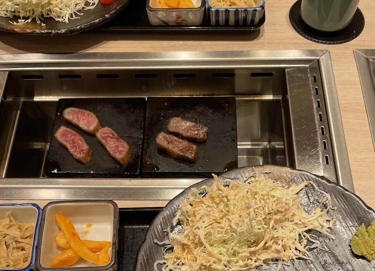 白飯、味增湯及高麗菜絲可續。牛肉非常嫩好吃可以烤自己要的程度,小菜和明太子也是非常好吃。點餐只有分小份和大份,差別在一塊肉和兩塊肉。會想再當回頭客。