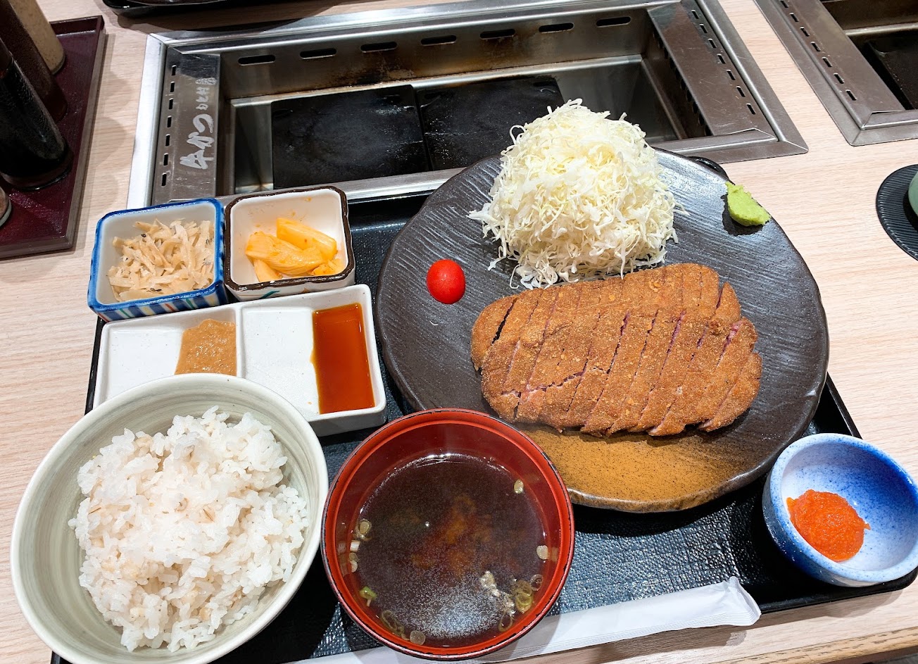 端午套餐好划算,是1.5倍的肉量~ 炸過的肉再用石板烤一下,真的不錯吃 生菜、飯、湯都是可以續的(小菜不行) 白飯配上明太子真的很好吃 特調的沾醬很解牛肉的膩