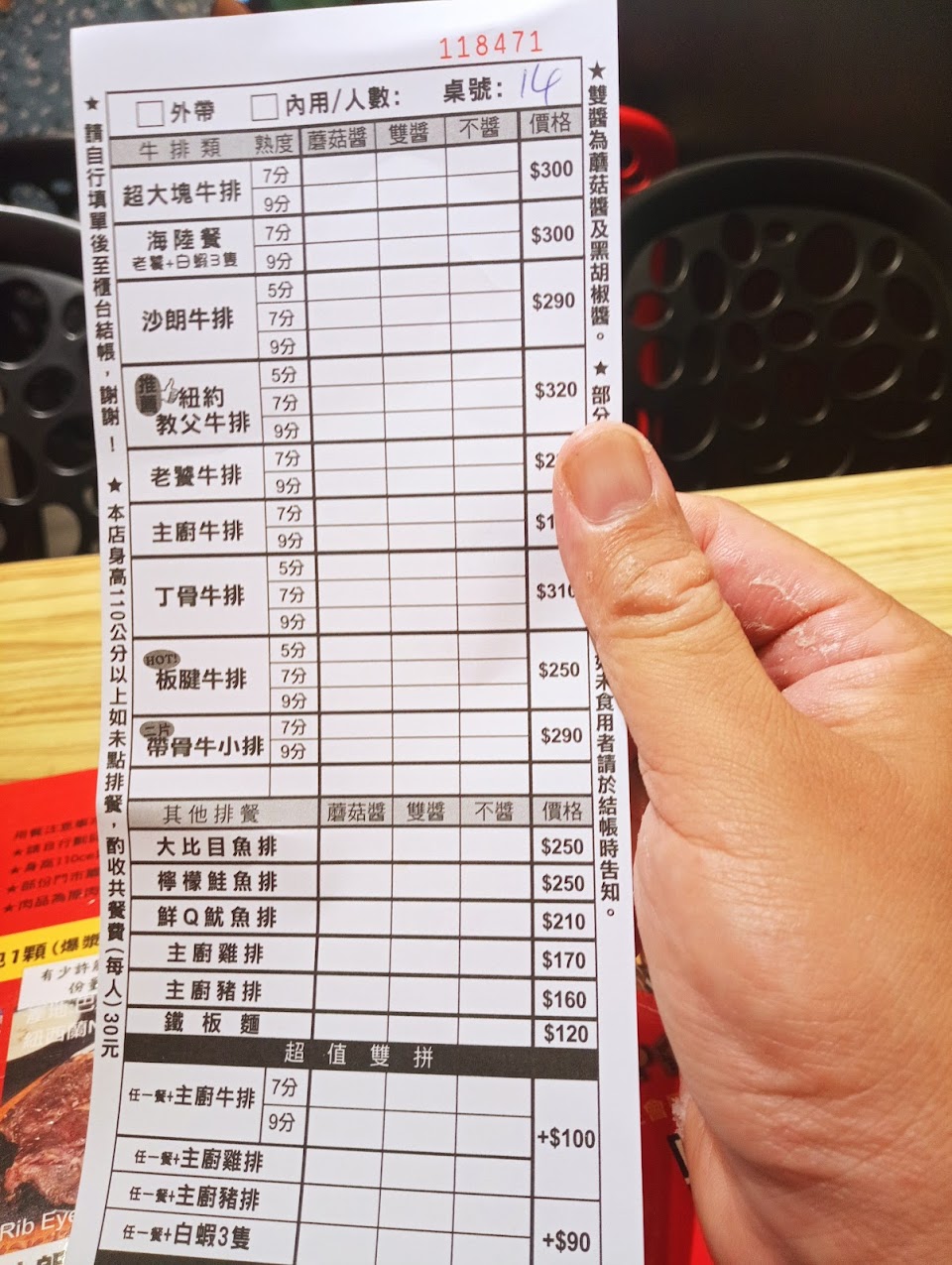 就夜市牛排,超大塊牛排的筋很多,吃起來沒有到14盎司的感覺,大概有7盎司都是筋吧XD 但有紅茶喝到飽,紅茶還行,就一個吃粗飽的夜市牛排店,綜合評分大概60,不會特別推薦,但也不會覺得差。