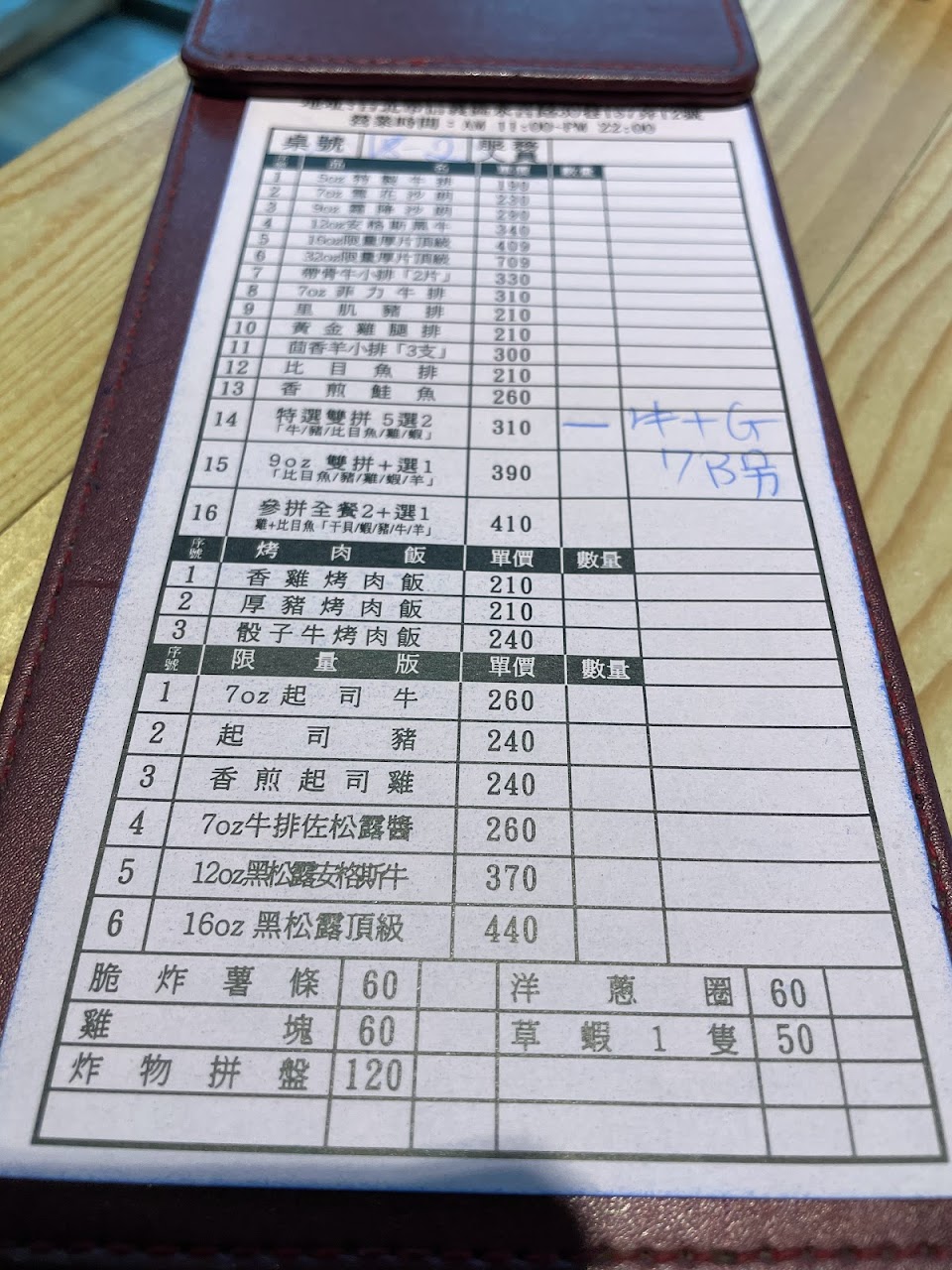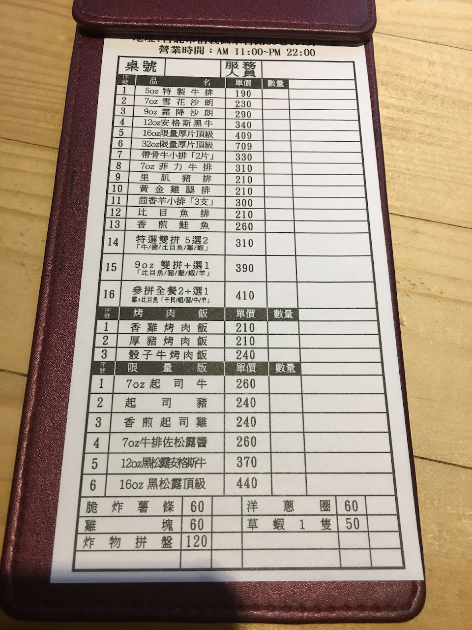 最便宜的牛排210,也有不少高價牛排選項。份量口味都還算一般還算可以。雞蛋鐵板麵是一定有的。當然一分錢 一分貨。便宜的牛肉當然筋都不會少。