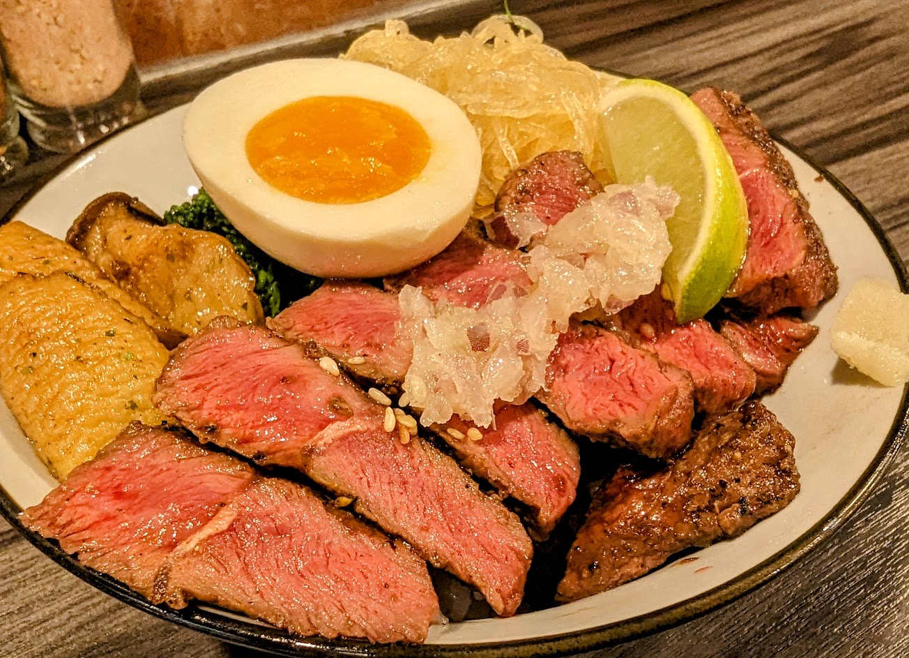 招牌的厚切牛排丼,帶著紅潤色澤與炭烤的香氣,牛排鋪滿整碗丼飯十分澎湃。
