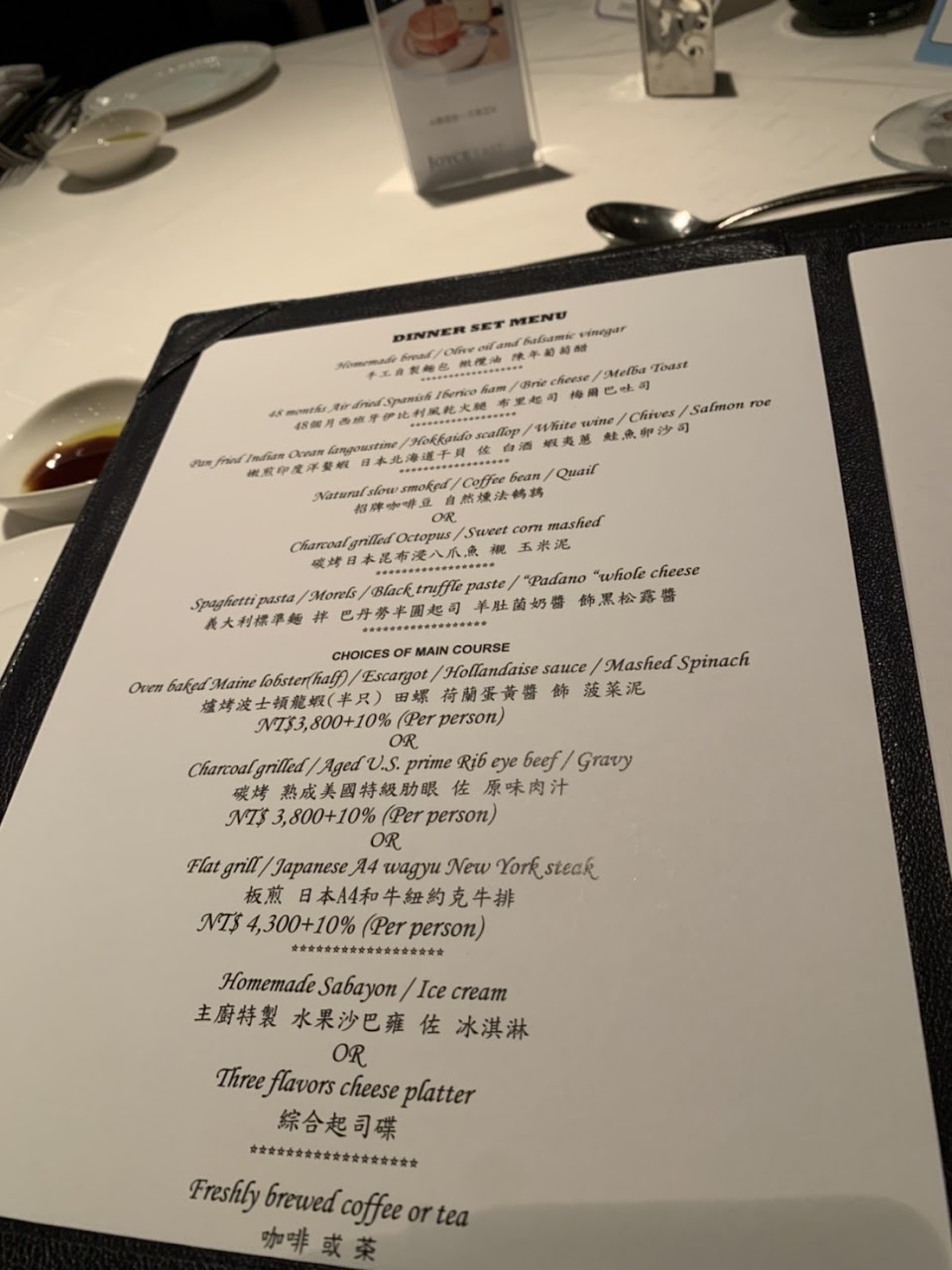 從進入餐廳開始,服務工作人員就親切細心接待,用餐空間與動向,食材與酒品的陳設都精心設計過。由JJ替我們安排了今晚特殊的餐點,空運來台的法國生蠔,脆嫩鮮美的海味讓我們食欲大增,西班牙的Jamón jabugo 5J級別,48月熟成火腿它的熟成油脂與甘醇肉質配上2009年Reviera de duero絕對絕配,5J火腿油爆法式蛋花與麵包令人回味,整顆黑松露刀刨帕瑪森spaghetti 主食的伊比利嫩煎豬排,飽滿肉汁顯現出廚師高超手藝,最後由甜點soufflé與咖啡結束這場驚豔的美食晚宴。