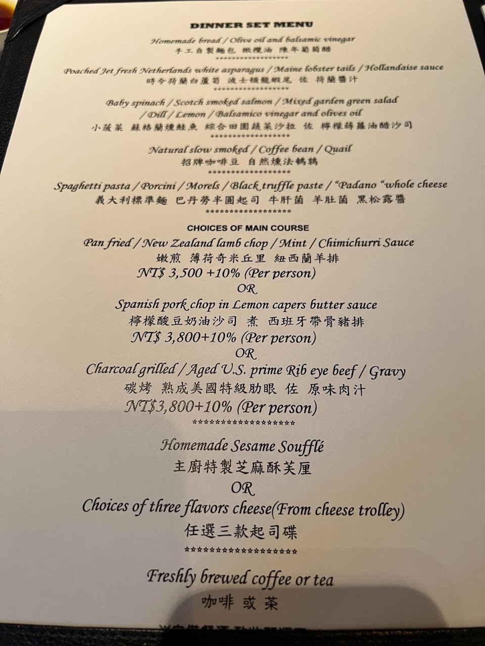 這是一家很傳統的法式餐廳,從前菜的生蠔到黑松露白蘆筍都非常到位,還有魚子醬蟹肉炒蛋也是絕了!主餐美國肋眼三分熟非常好吃,如果不吃牛伊比利豬也處理的恰到好處,最後甜點的舒芙蕾太讚了,手工自製的冰淇淋隨便都打趴哈根達斯,吃得太飽!有機會會想再訪?? …