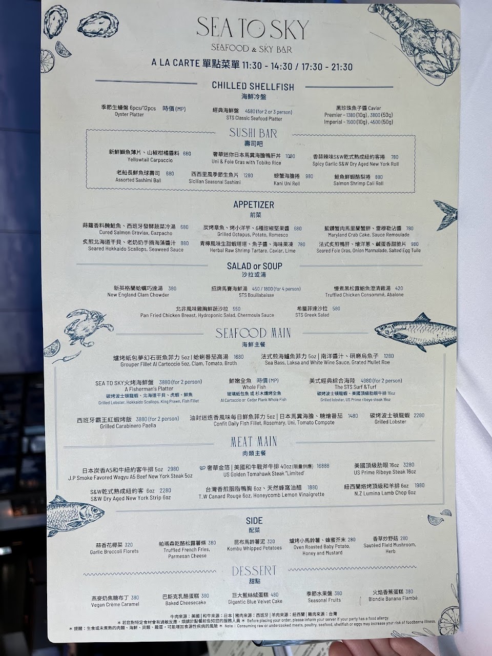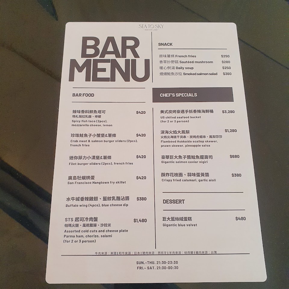 此外,還有多款精緻的開胃菜、主餐配菜,以及每日精選甜點,如提拉米蘇和精選芝士盤,為您的用餐體驗增添層次。 不論是美食愛好者還是尋找浪漫約會地點,SEA TO SKY都能為您締造難忘的高級美食之夜,讓您在品味佳餚的同時,沉浸在壯麗的全景美景中。 服務 內用 餐點類型 晚餐 平均每人消費金額 超過 $2,000 餐點:5 服務:5 氣氛:5 建議的餐點 羊排 美國頂級肋眼16oz牛排 吉谷拉生蠔 台灣究好戰斧豬排 藍鑽蟹肉馬里蘭蟹餅 提拉米蘇