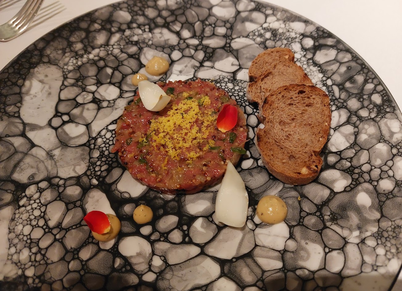 麵包、前菜(菜名:向日葵)和湯(野菇濃湯)都還不錯,但點的羅西尼牛排五分熟稍嫌有點老,羊排很香,甜點及茶也都普普;但訂位以及前一天確認訂位資訊時,從頭到尾都沒說明威靈頓牛排需要事先預定,另外服務生的服務很差,完全不是五星級飯店的水準,而且女性主管講話很大聲,感覺很怕事不願處理客戶反應,若不要抱太大期待會有比較好的用餐感覺