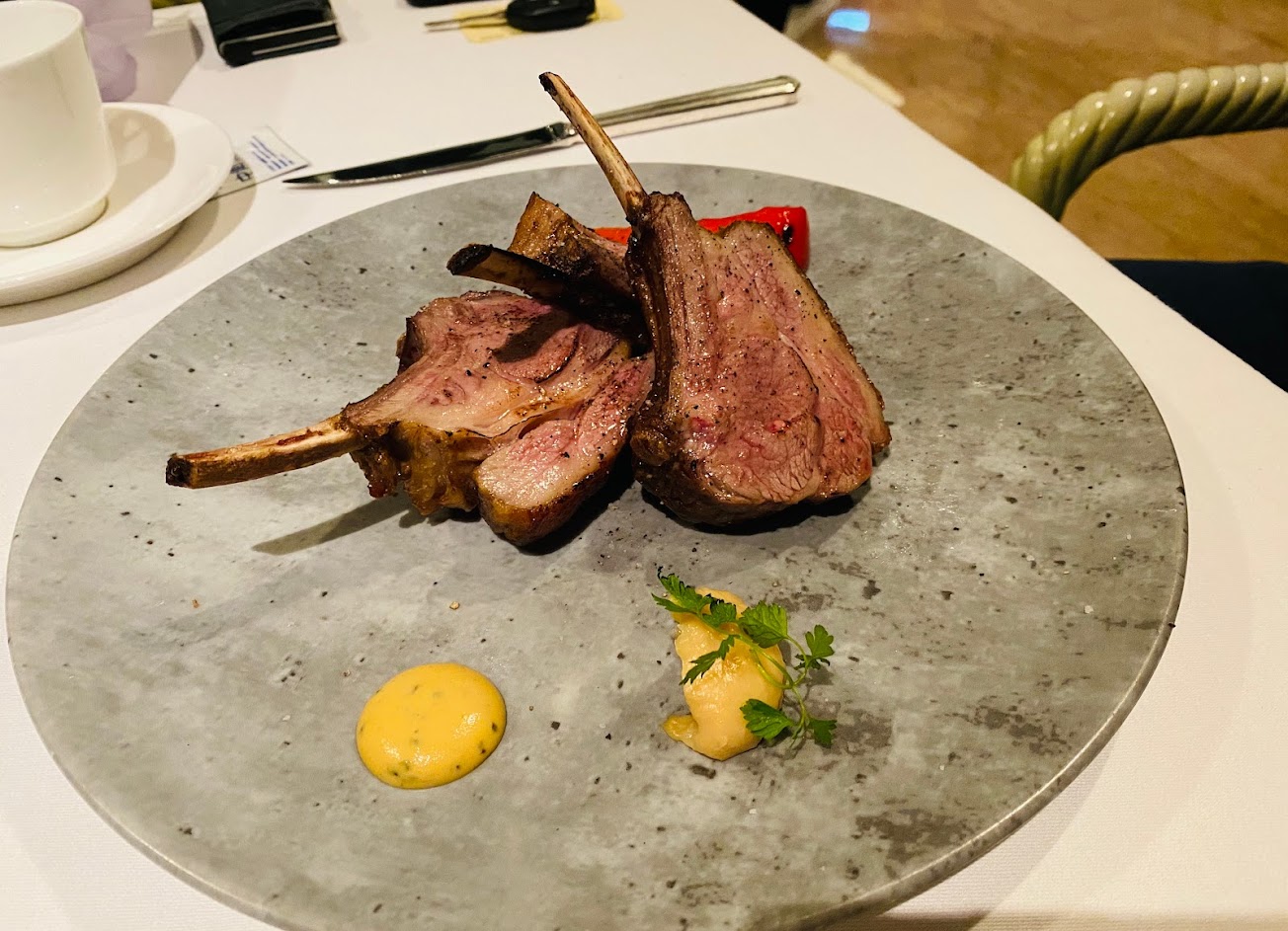 層次有序,老牌名店 餐前麵包四種都不同口味,奶油給的很豪邁 前菜部份擺盤相當可愛,但口味沒太多記憶點 洋蔥栗子濃湯非常的濃郁,別以為只是湯,相當有飽足感 主餐肋眼牛排配大蝦,餐廳建議五分熟或七分熟,選擇了七分,口味得當,大蝦彈牙 最後的甜點非常大份量