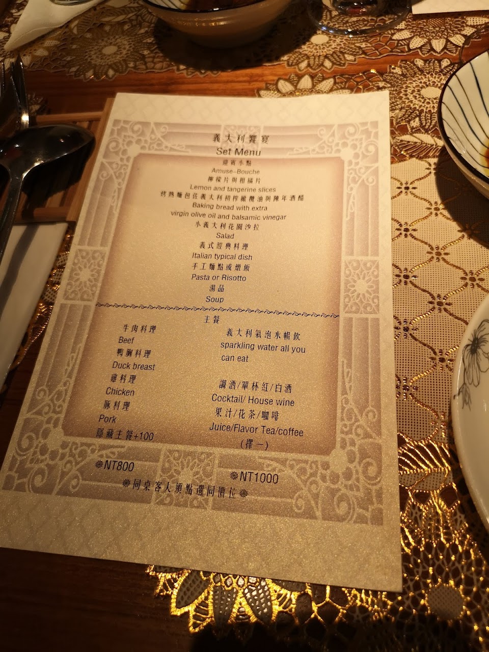 二訪小義大利,這家店基本上就是吃套餐,除了要選主餐、飲料和甜點外,其他都是配好的。整份套餐有餐前麵包、冰沙、沙拉、湯品、一道熱菜、主餐、甜點和飲料,每一道都不錯,可以感受到老闆的用心。主餐就是從豬雞鴨牛海鮮(1000元)選一個,每一種都有隱藏版(1200元)的選擇。剛好那天客人不多,老闆還請我們試了最近研發的菜單。我的食量很大,但吃完整個套餐也是超飽…