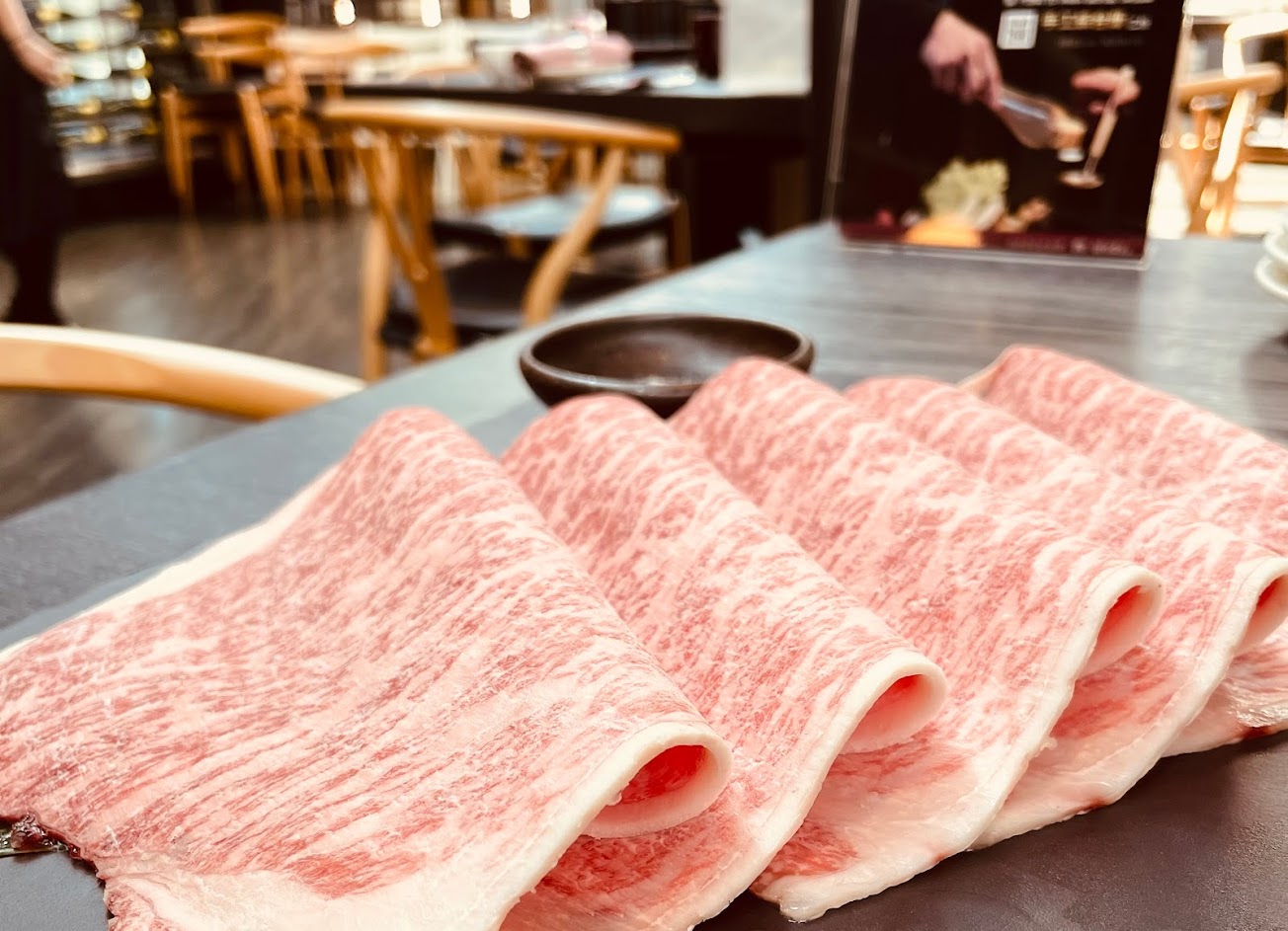 來自日本鹿兒島的A5和牛是榮獲「2017和牛奧林匹克大賽」的綜合評比冠軍,選用的是肩胛靠近背部的部位,肉質細緻油花分布均勻,油脂較少,特色是牛肉風味濃厚,越嚼越能散發出和牛肉質的原味,店家更附一碟鹽岩能讓顧客搭配食用。一份有5大片,切的份量大片中又帶有厚度,放入鍋中5-7秒鐘至肉呈現粉嫩5分熟即可起鍋,入口後便能感覺到濃厚的牛肉香氣,充斥在整個口腔裡面,肉質的口感偏向有嚼勁,可以體會出牛肉慢慢散出肉汁的態樣,如果蘸取鹽岩入口,更提升肉質鮮甜度。