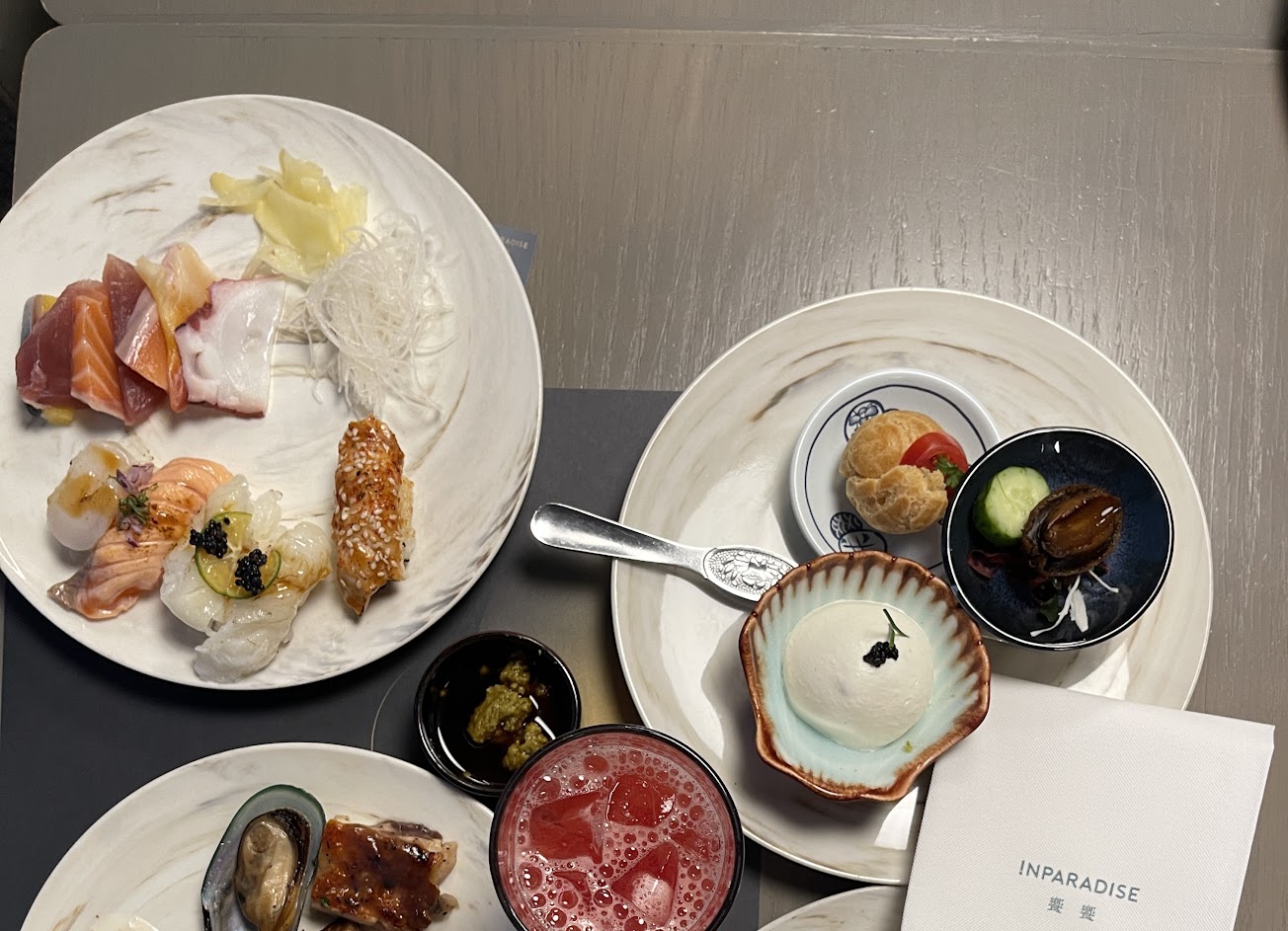 2023/2/16員工聚餐,可以眺望101欣賞天空,生魚片我覺得非常新鮮,吃爆!舒芙蕾是限量的,同事沒吃的都給我吃,吃了五個舒芙蕾,推推,本人不喜歡吃甜點,所以只吃了可麗露,但其他甜點看起來也很好吃,特別是甜點區旁的蜂蜜牆非常壯觀,調酒醇勳爵士酒味比較重一點,紫韻浪漫也不錯喝,金燦夜空我喝起來感覺是沒有酒味像果汁,壽司那邊有一個梅酒,那個喝起來也是甜甜的像果汁,如有聚餐機會下次還會想來吃,如果是四人或兩人訂位可以靠窗,我們聚餐是20多位,所以沒有靠窗,這點我覺得比較可惜。