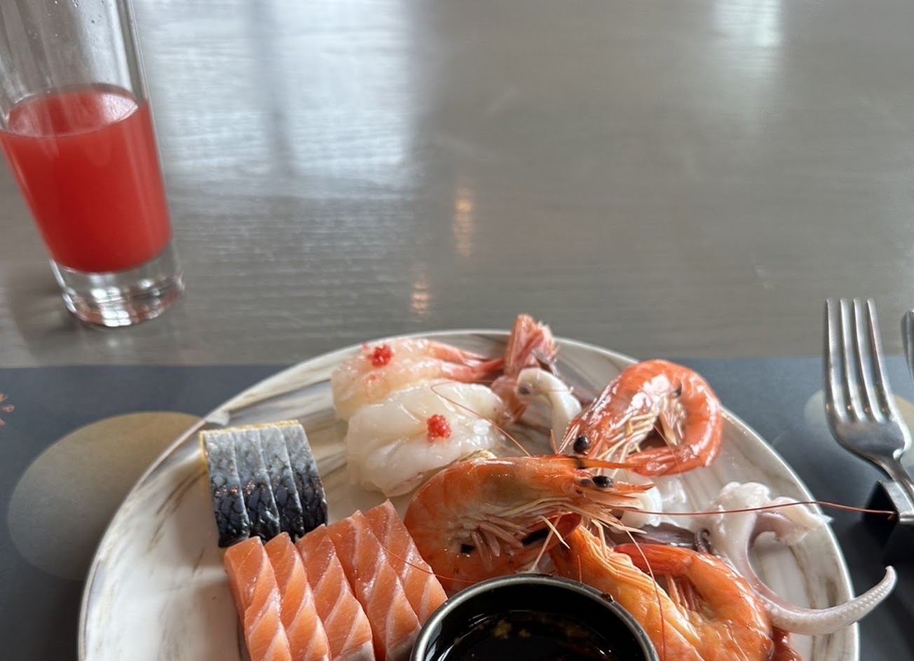 很幸運坐到靠窗位置,視野超棒? 特別的是會有機器人逐桌收取餐盤。食物都是在水準之上,尤其是超人氣的鐵板區,會有蝦子、羊排、牛小排,每樣都好好吃~可惜的是平日中午的鐵板區現在沒有供應干貝?