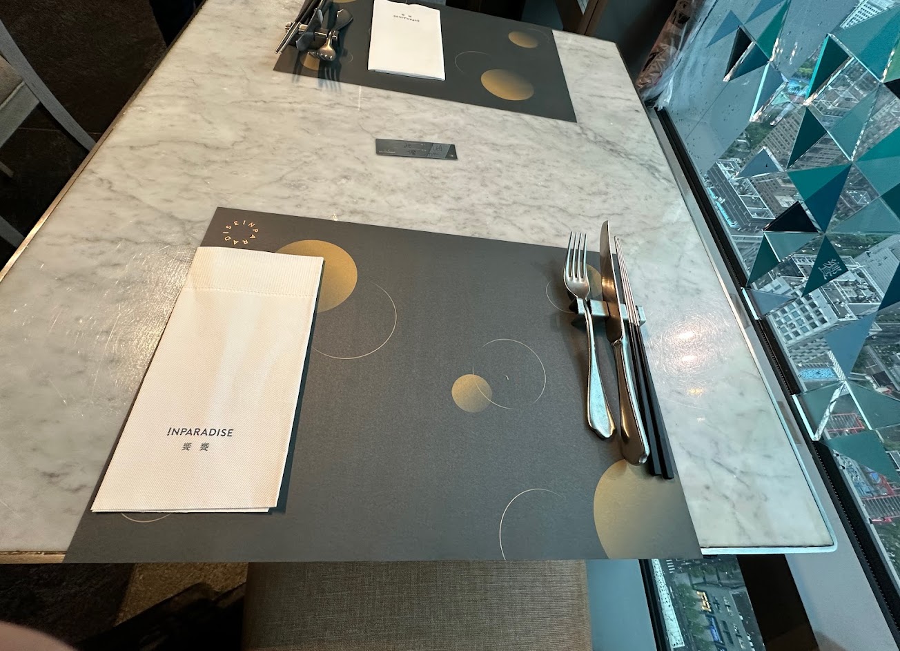 往饗饗路上有電梯小姐~到櫃檯覺得蠻氣派,雖然有訂到窗邊,但因為下雨所以風景直接看不見:)服務人員態度都不錯!收盤速度也蠻快不會堆得滿桌都是?