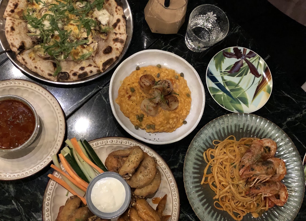 疫情期間,餐廳防疫措施作的很足,值得讚賞。餐點CP值很高~可惜到訪日pizza烤爐剛好有狀況。這裡果然也是很適合拍照的網美地點。推綜合炸物~炸生蠔size也不容小覷!推北海道干貝蝦膏起司燉飯(香氣足好吃)及泰國風情義大利麵(帶點微酸及微辣,好好吃?)飲品我們也點了不少~(一直想來這裡喝黑糖牛奶?!滿頭疑問的點了,黑糖牛奶應該點熱的,雖然點錯點冰的,但是味道超棒啊?)大頭紅茶不推,這個價位……?,鮮奶茶一般般,酒類可以品嚐,真心建議這間店適合分享餐點,可以不需要每個人點主餐(因為這樣其他餐點例如沙拉和炸物及飲品會完全吃不完),有機會會再訪。