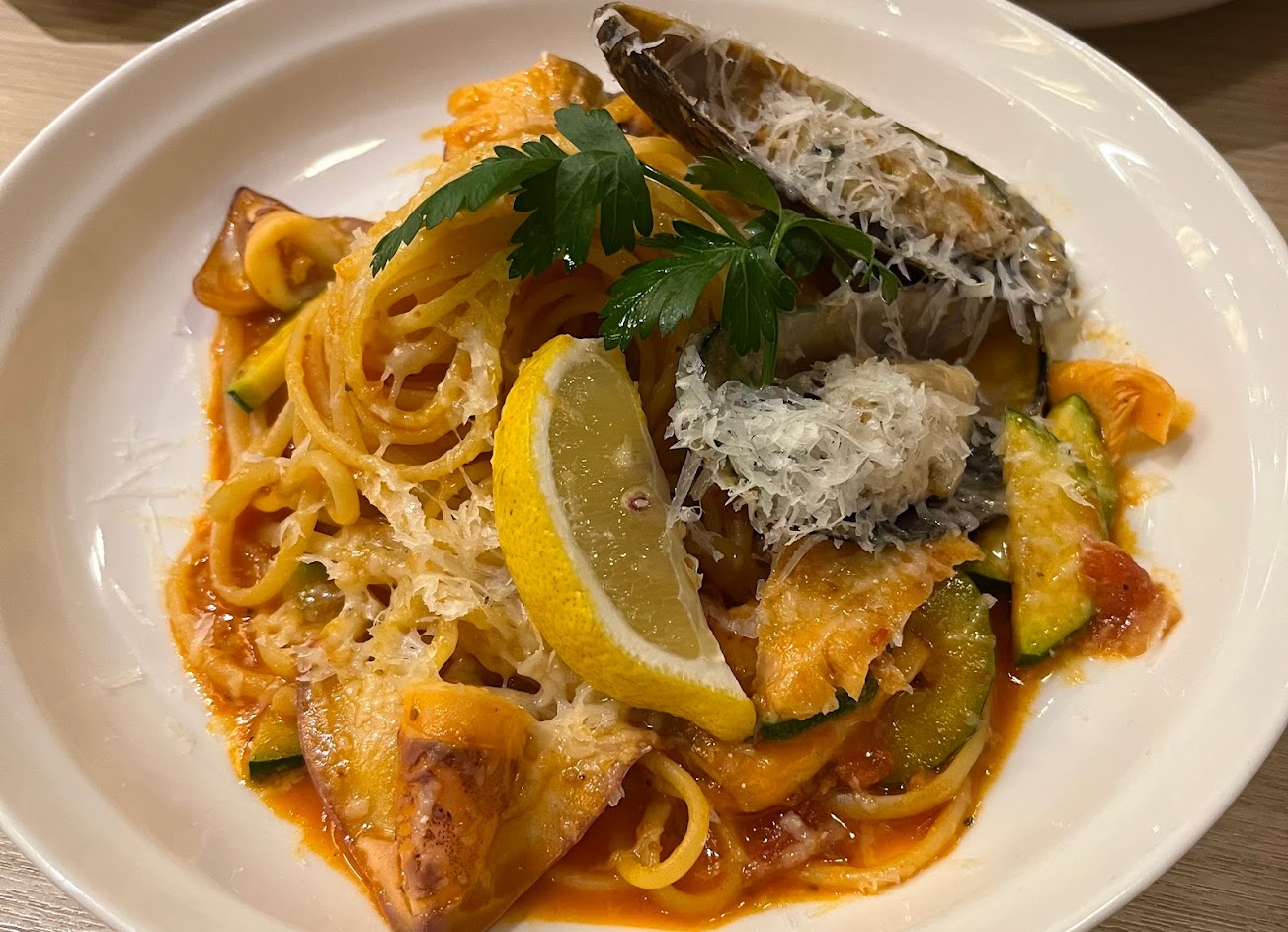 基底番茄醬有一點煙燻味,可自己擠檸檬調味,味道還不錯。有兩隻蝦跟牡蠣、花枝等海鮮,麵條Q彈好吃。