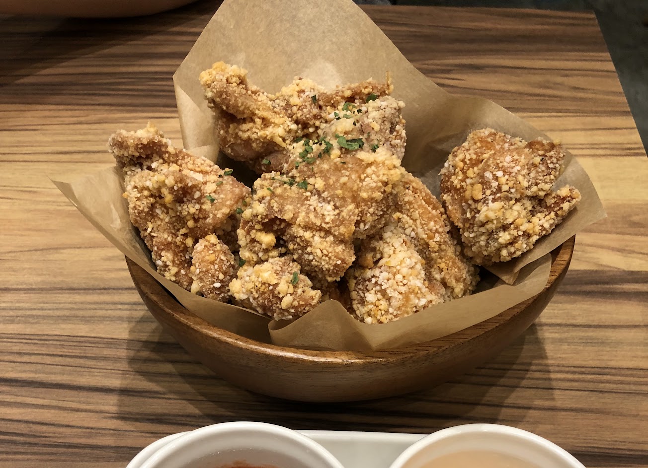 炸物拼盤的花枝圈非常好吃,但小雞腿肉肉卻偏乾柴,略為可惜。