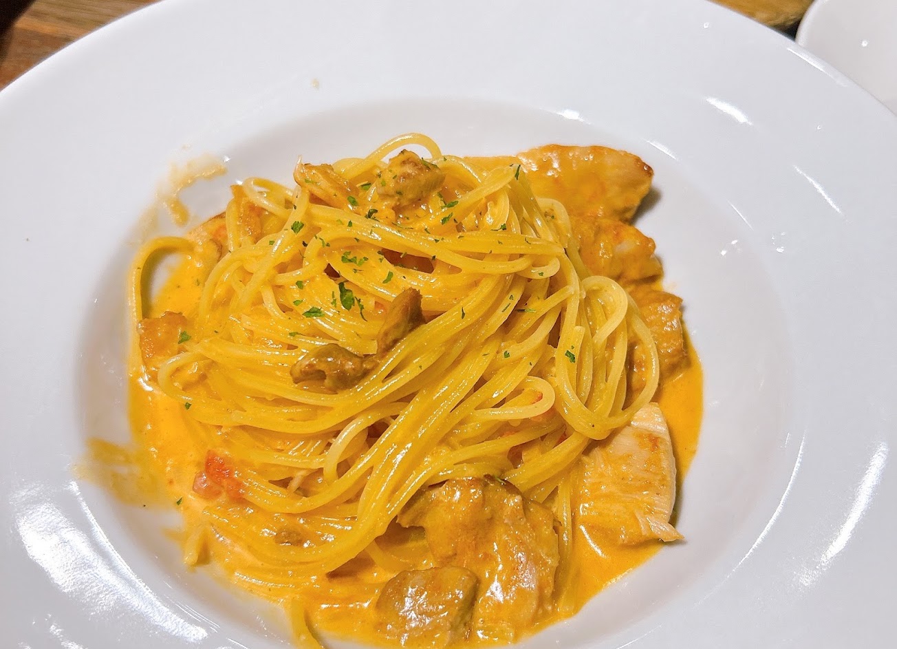 前菜爐烤麵包中空三角型口感不錯,沾著貝醬微酸甜開胃,即始冷掉也好吃。蒜辣野菇雞肉麵加大加30元,份量很夠!醬汁夠味、麵條軟硬適中很順口。炸雞跟魷魚、薯條都有水準,甜點提拉米蘇雖然稱不上出色,但軟綿卻不會過甜,只是出汁不知道正不正常⋯