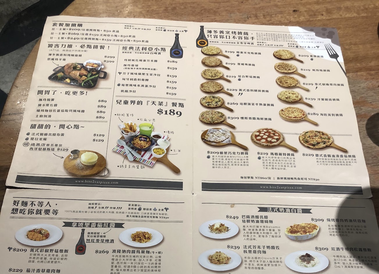 菜單內容餐點為單點主餐的義大利麵、披薩以及燉飯,另外還有開胃菜、法利亞小點、甜點可以做單點,但是服務人員會建議搭配套餐比較划算哦!