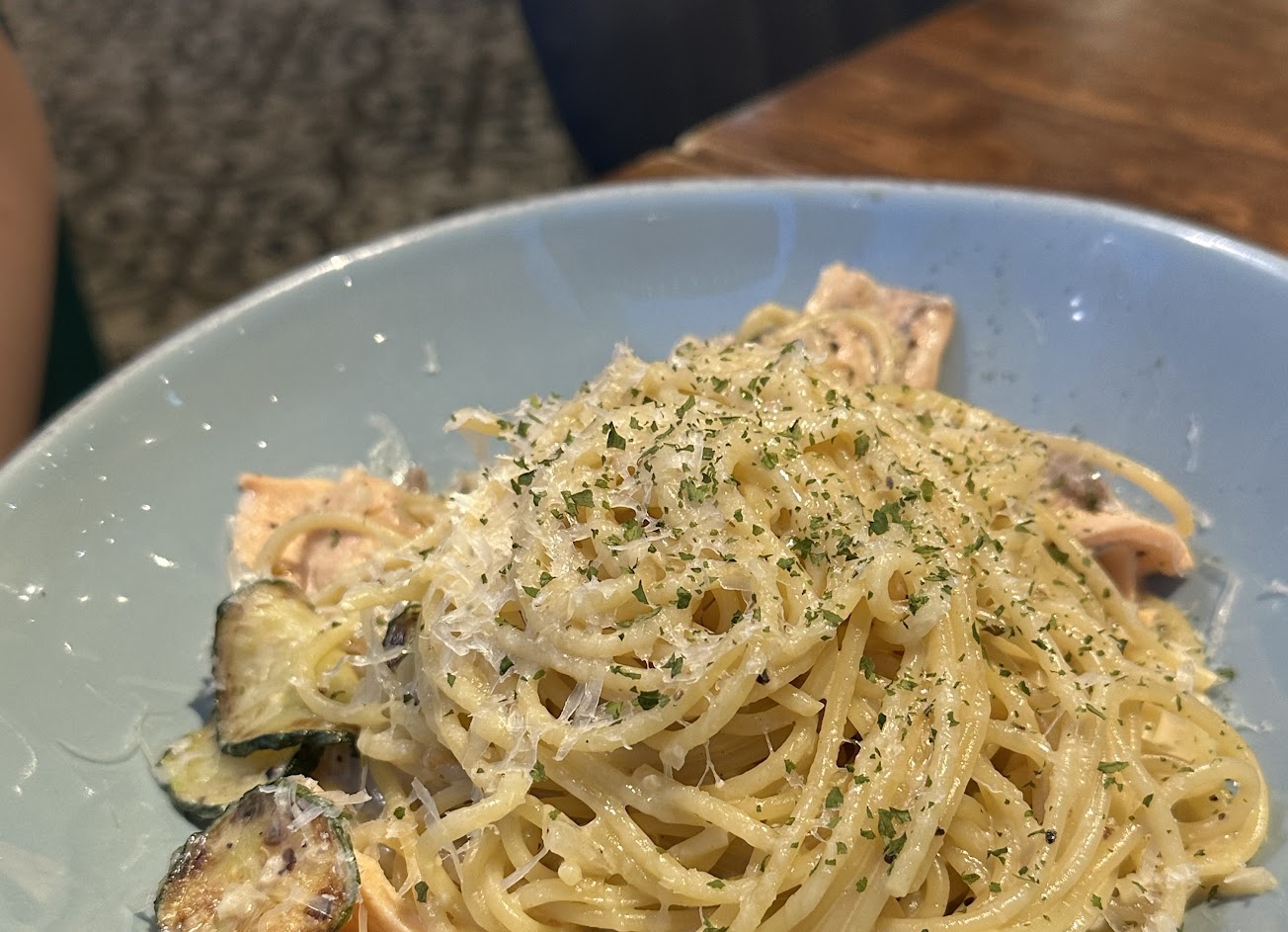 好吃~ 加好友招待的透抽份量很多 節瓜鮭魚義大利麵 麵底下超級多鮭魚的?