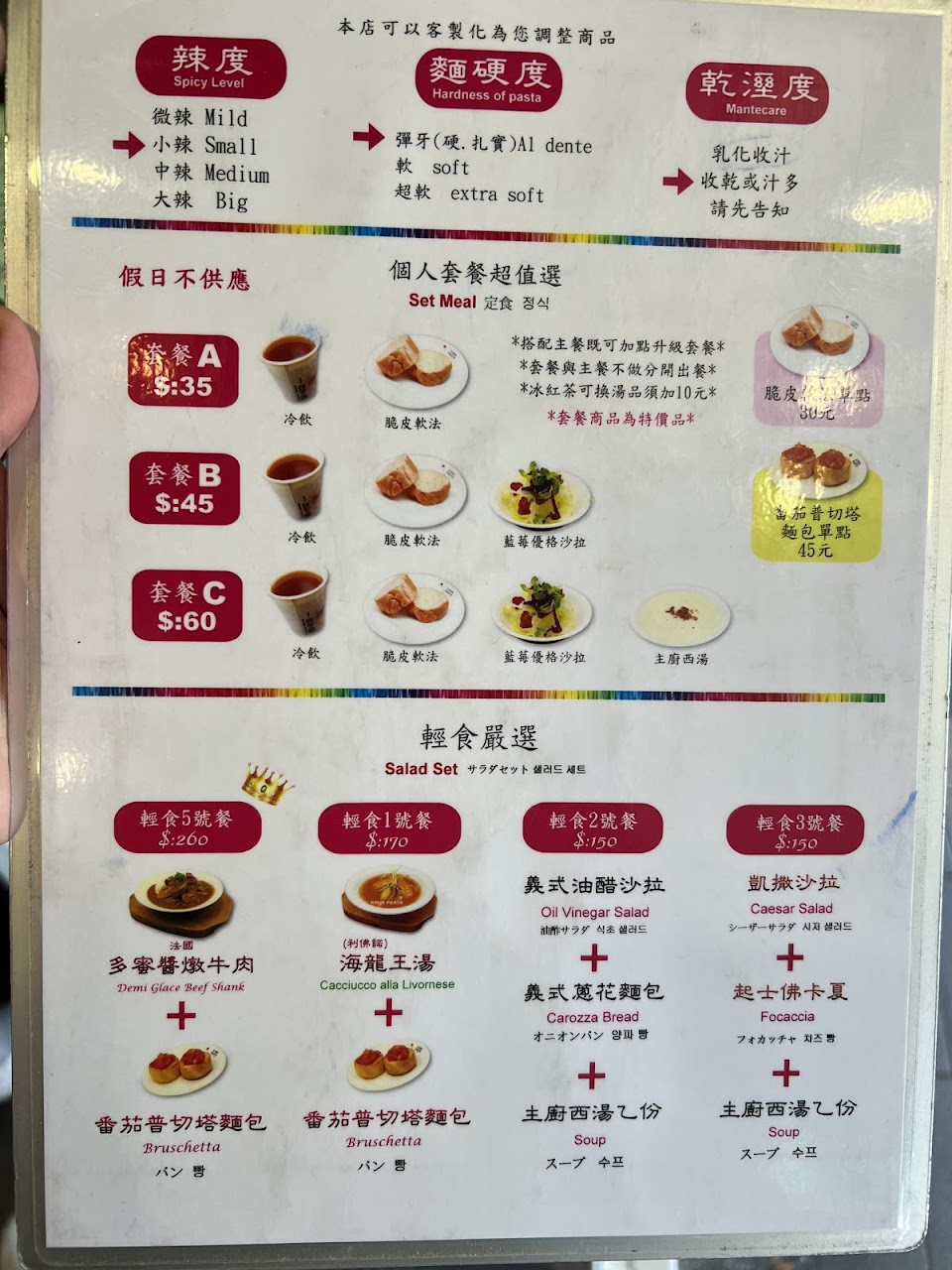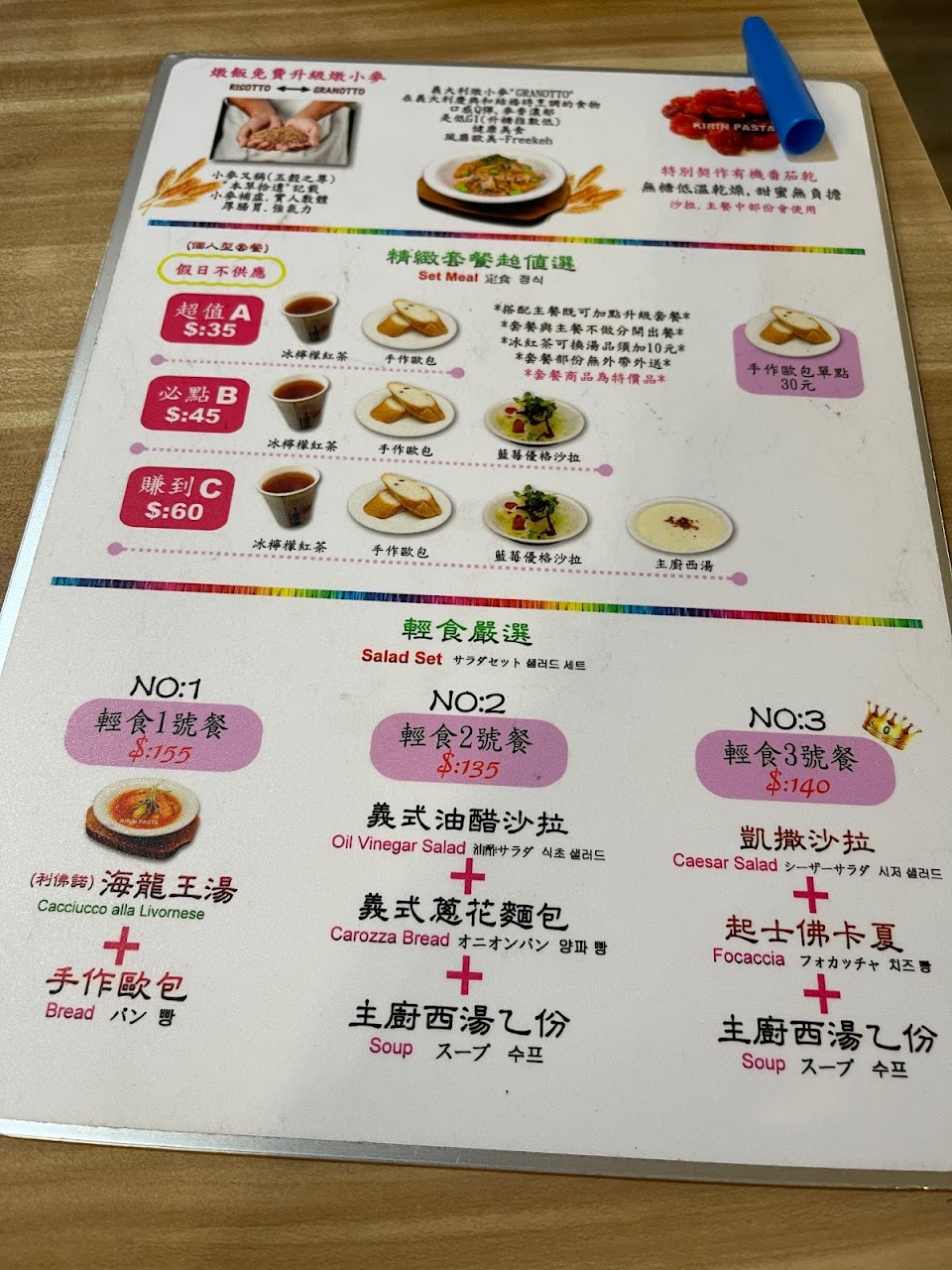 餐點普遍較一般的義大利麵店多,上餐速度也快,口味選擇也蠻多的,還有甜度剛好不會太過甜的檸檬紅茶與奶茶可自取,用餐環境也維持一定的整潔、明亮,裝潢色調也蠻能提升食慾,推薦!