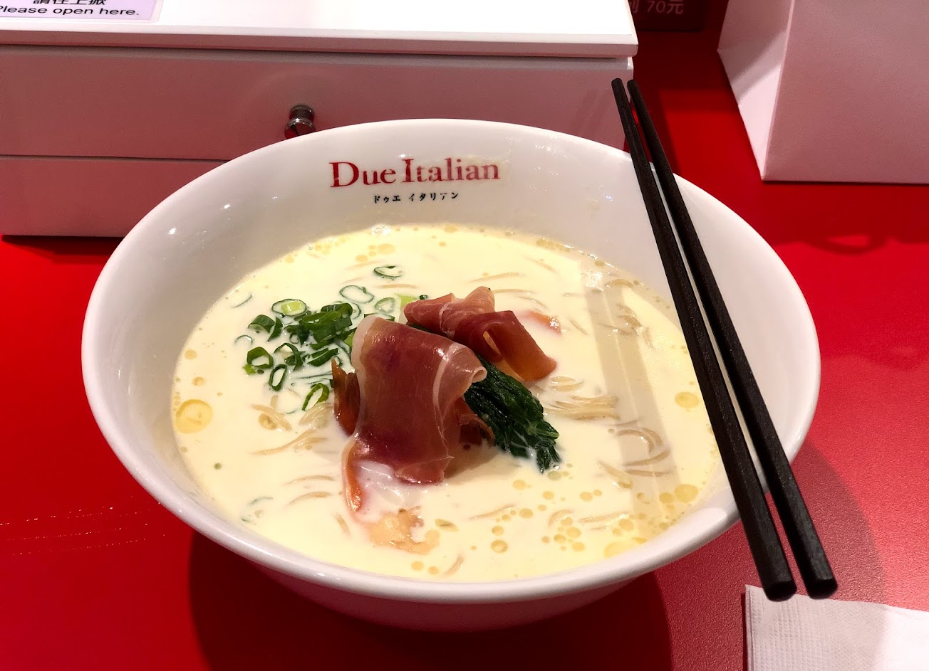 東京米其林指南推薦的Due Italian.整體很喜歡、因為是很創新的口味。白色雞湯拉麵裡頭有兩片生火腿、生火腿本身很厲害、湯頭很像牛奶鍋但是雞湯底喝起來更溫潤、麵條好吃外觀很像義大利麵但吃起來就是日本拉麵。特別點了叉燒飯果然沒讓人失望、日本餐廳叉燒飯都小小碗的單吃應該會不飽足哦。服務人員也很貼心會過來問口味是否合適。日本餐廳確實湯頭及叉燒口味都比較重一點。推薦給大家