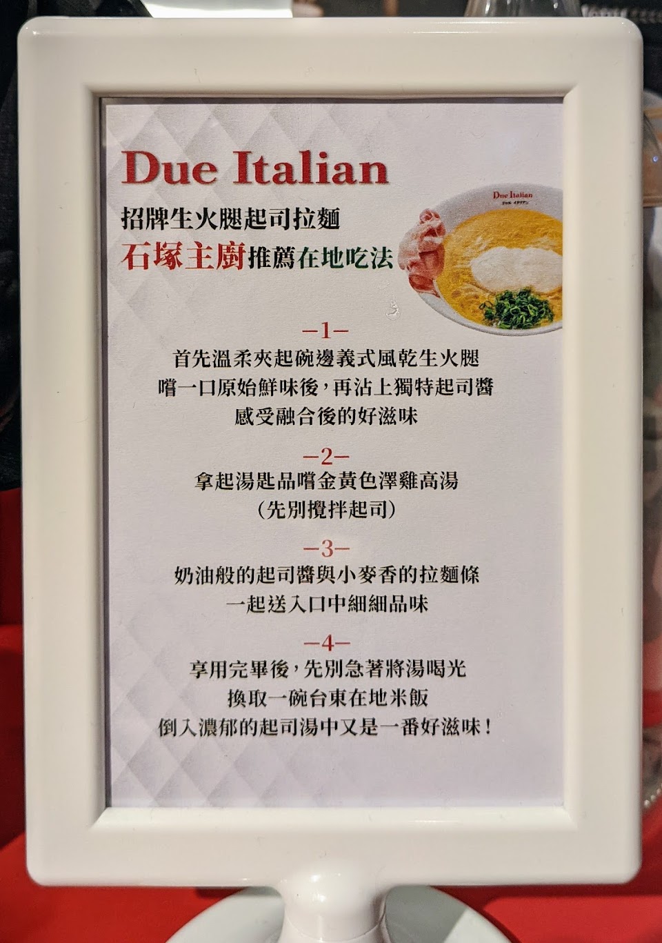 生火腿起司裡面點餐時會詢問要正常還是半鹹,若平常沒有吃那麼重口的人點半鹹就好了,正常吃到後面會很口渴,麵條軟硬適中(不能調整),搭配雞湯和cream cheese的組合體驗很新鮮,附一碗白飯。