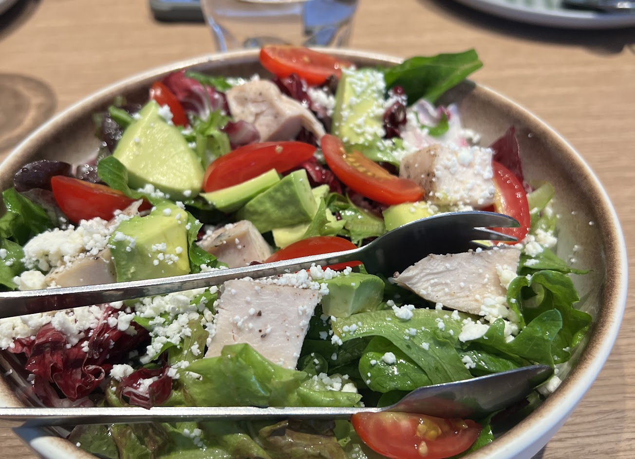 酪梨雞肉沙拉是很棒的輕食選擇,裡面有嫩雞肉、生菜、酪梨、小番茄,淋上沙拉醬與乳酪,炎炎夏日享受美食也要讓胃清爽一下。